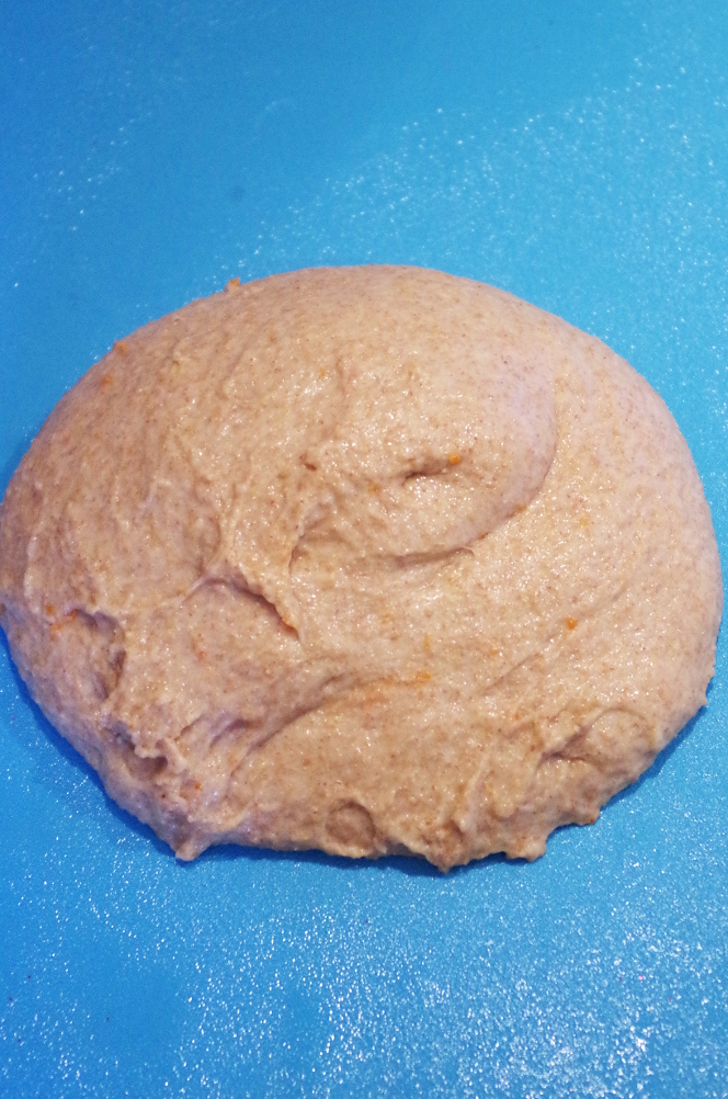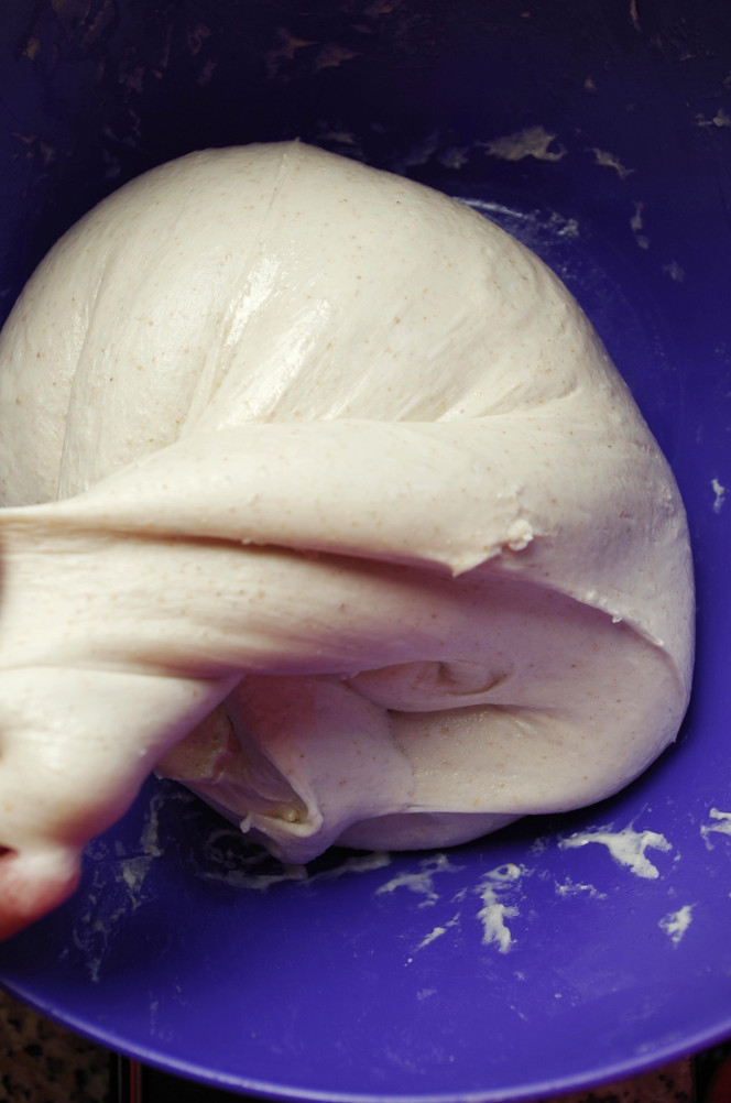 1) Первый способ - самый известный и популярный, когда тесто постоянно сворачивается внутрь, растягивается под давлением ладоней, вдавливается в стол и снова сворачивается внутрь и так по кругу. Мне кажется, мы уже рождаемся с этим знанием — как месить тесто, точнее, как месить тесто именно так, потому что так его месят и дети, и взрослые, которые ни разу в жизни до этого не делали ничего подобного. Для меня важным показателем степени развития клейковины является момент, когда с тестом становится удобно работать на весу, а не на столе или в миске (если теста не сильно много)).