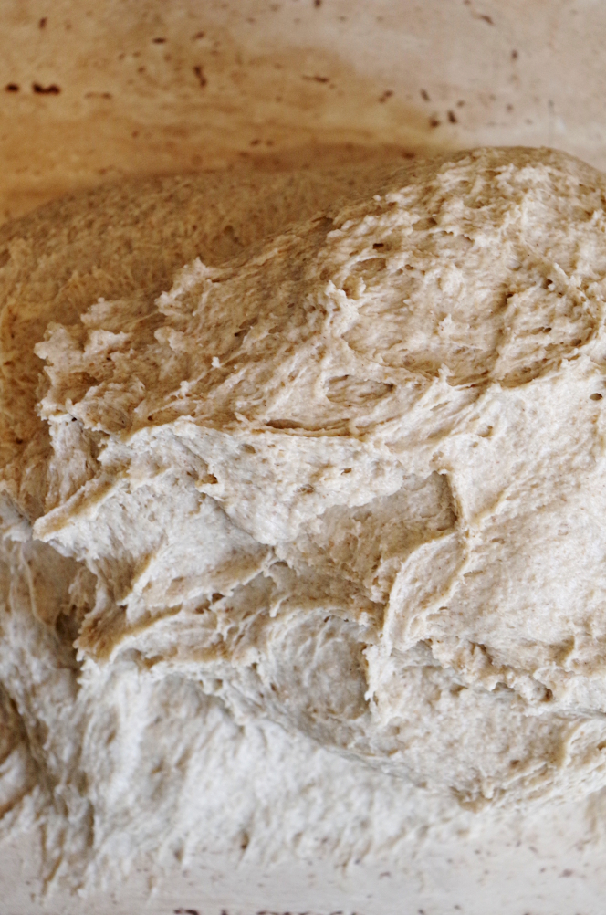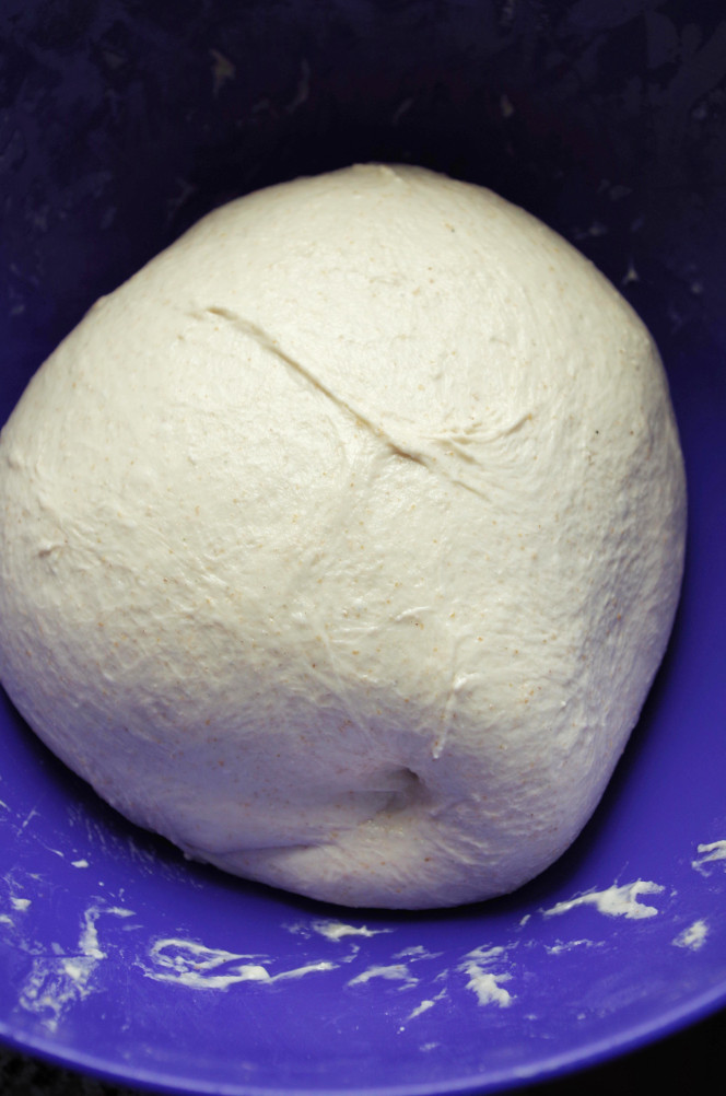 Получается плотный конверт, который можно в таком виде уложить в миске ферментироваться, а можно еще подкатать, чтоб получился упругий шарик. Во время этих манипуляций с тестом происходят две важные вещи: во-первых, развивается и упрочняется клейковина, а во-вторых, захватывается воздух, что хорошо влияет и на брожение, и на клейковину.