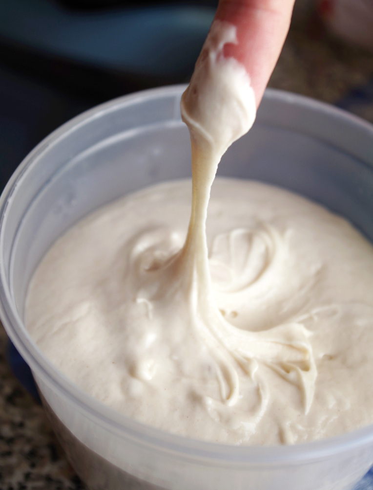 Хочу отдельно заметить, что перемесить тесто руками, то есть, разрушить клейковину, практически невозможно. Но клейковина может разушаться не только от перемеса, на нее плохо влияет высокая температура (ближе к 40 градусам), слишком высокая кислотность и очень долгая отлежка (на третьи сутки отежки в холодильнике ослабление клейковины уже очевидно). Вот в качестве иллюстрация несколько картинок. Эта опара очень долго бродила и по консистенции стала, как заварной крем.