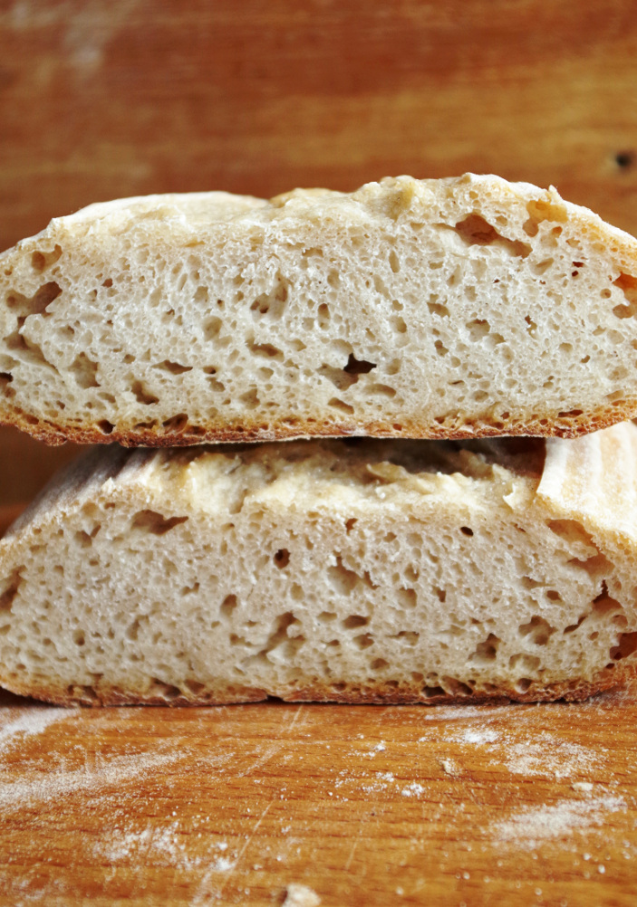 И сразу же хочу сделать заявление)) На самом деле, ничего нового, как всегда — очевидное: любое хлебное тесто должно быть хорошо вымешано, в нем должна быть развита клейковина, иначе не получится хорошего хлеба, так что схалтурить не удасться. Если просто смешать муку и воду до однородности, выбродить пару часов и испечь, получится неудовлетворительный хлеб. Он будет плыть во время расстойки и выпечки и крошиться во время нарезки, кроме того, пористость такого хлеба будет очень «смазанной» на срезе, да и на вкусе скажется. И не важно, кто недомесил: пекарь руками или машина крюком, результат будет один. Недомес показательно заметен на влажном тесте. К примеру, если тесто на чабатту плохо замесить, с ним вообще невозможно будет работать. Кроме того, что оно будет нереально липким, оно будет расплываться в лепешку на расстойке, а вместо крупной красивой пористости, под коркой обнаружится скопище грубых рваных пор с толстыми стенками, да и сама чабатта будет напоминать грубую подошву.