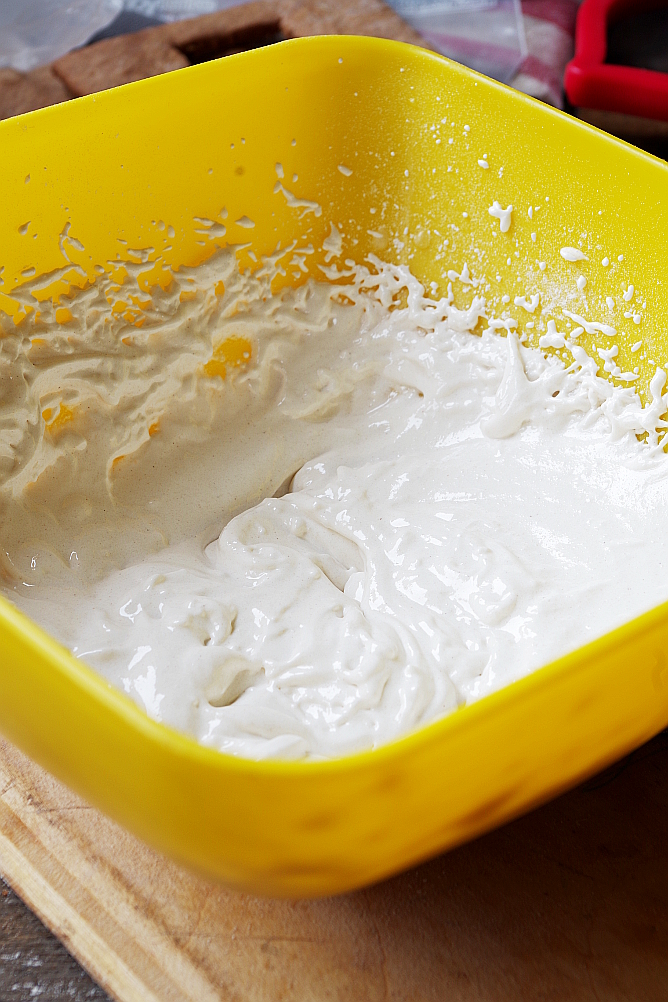 4) Делаем глазурь. Буквально перед тем, как разрисовывать прянички, отделяем желток от белка, к белку добавляем сахарную пудру и взбиваем миксером минут 10, в конце добавляем немного лимонного сока. Вот такое должно получиться.