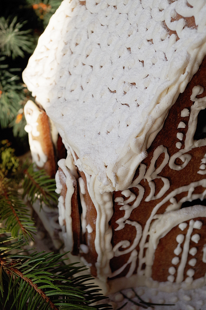 Вот, собственно, и все, остается только посыпать сахарной пудрой, украсить еловыми веточками и домик готов! Кстати, сегодня этот домик совершенно без потерь пережил часовое путешествие на машине, упакованный в обыкновенный пакет «из супермаркета».