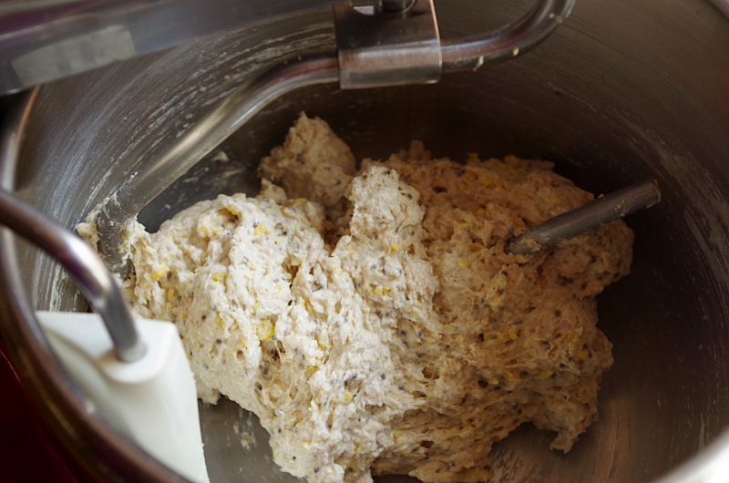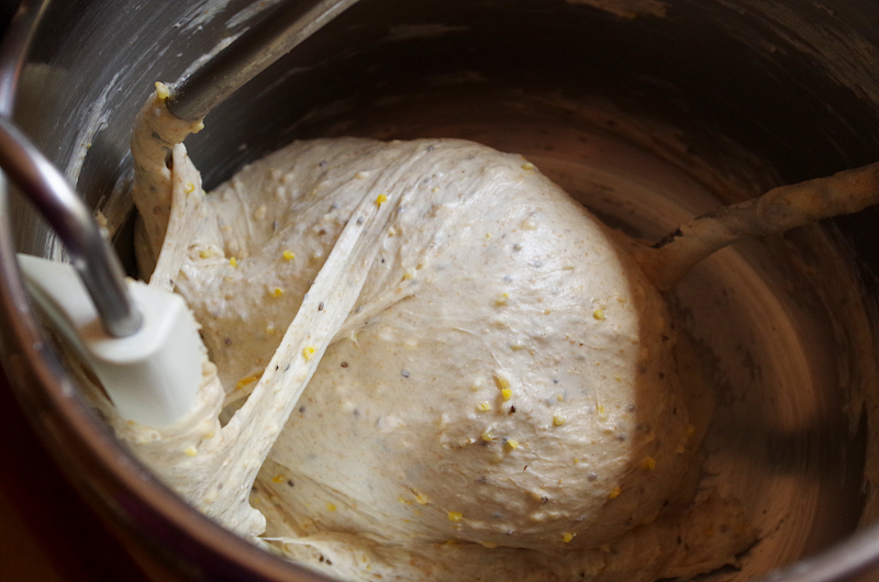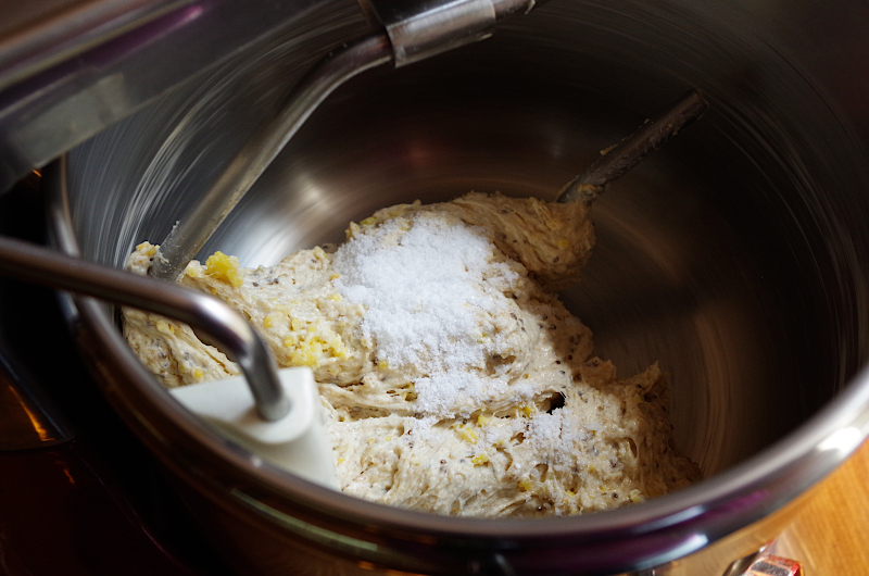 В конце замеса, когда тесто станет гладким и эластичным, внесите сливочное масло. Продолжительность замеса в Ankarsrum около 25-30 мин. на 2 скорости.