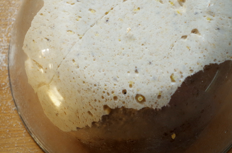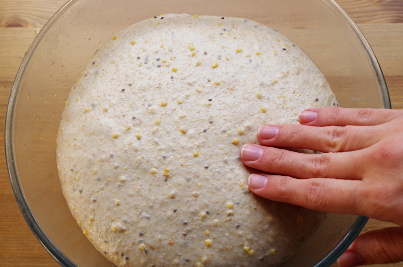 Брожение при 22-24°. около 2,5-3 часов с одним складывание через 40 мин. после замеса. Если не знаете, зачем нужны складывания и обминки, для вас целая статья! При более высокой температуре брожение пойдет быстрее, но возможно проявление кислинки во вкусе. Вам нужно обязательно дождаться, чтобы тесто хорошо подошло, стало пышным. Если вам пока сложно понять, подошло тесто или нет, почитайте эту статью.