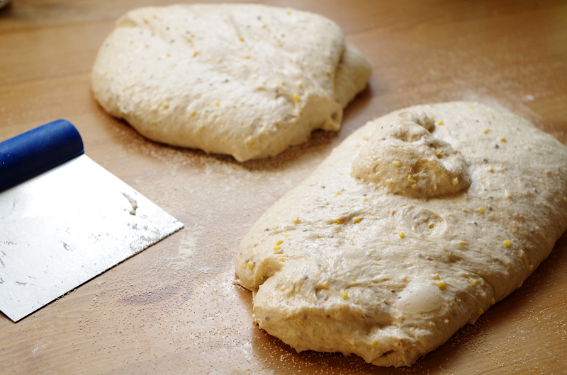 Вывалите на стол подошедшее тесто и разделите скребком на две части:
