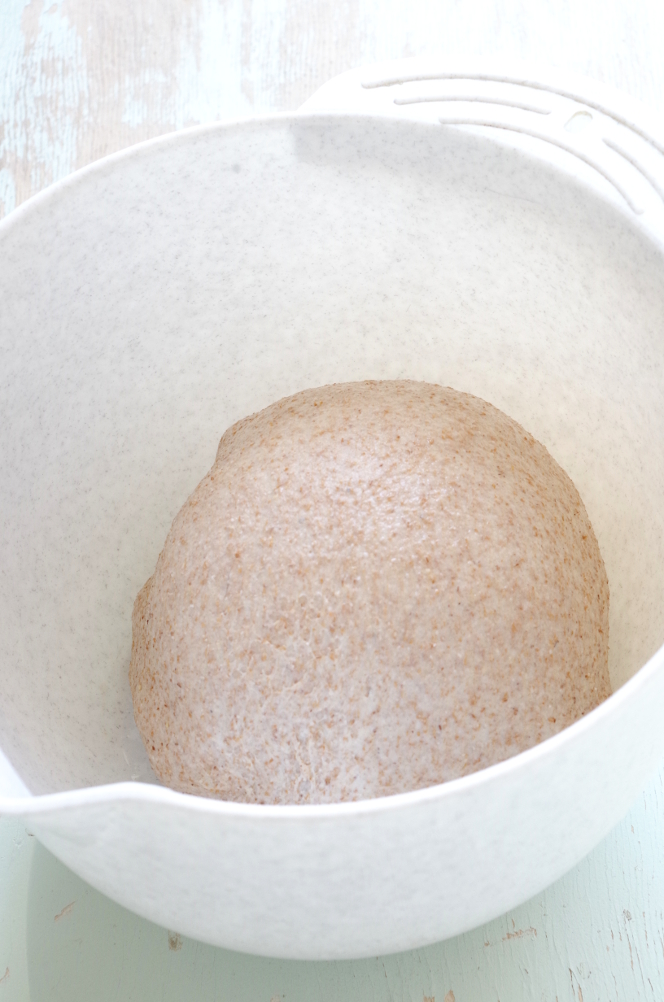 Я поставила тесто бродить в холодильник, где оно простояло около 5 часов, за это время оно хорошо выросло. Если же оставить тесто бродить в комнате, на это должно уйти около 2-2,5 часов. В любом случае, нужно смотреть по самому тесту и собственным условиям, оно может подойти быстрее, тогда важно вовремя сложить его и сформовать, чтобы оно не перекисло. Аналогично, если тесто за указанное время не подошло — нужно немного подождать, если холодно, поставить в тепло. Важно при этом, чтобы тесто было хорошо укрыто и его поверхность не заветривалась. Можно накрыть тесто высокой миской и оставить на рабочей поверхности.
