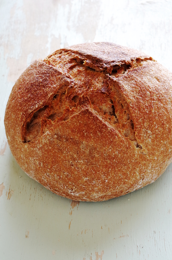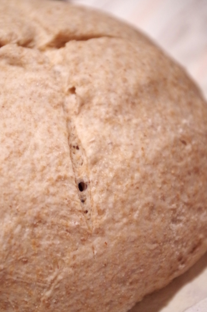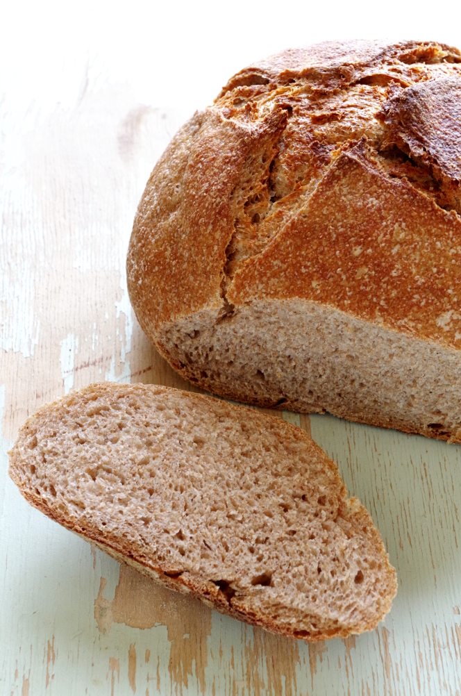 Я, честно говоря, сначала хотела переделать этот хлеб, что-то в нем мне показалось непривычным, поэтому оставила буханку лежать под полотенцем, ждать участи быть скормленной голубям. А через пару дней приехал в гости брат с семьей и хлеба моего в миг не стало! Голубям не досталось и крошки! Я даже удивилась, как это так они оценили, а я нет. А потом сама попробовала и обрадовалась, действительно, хороший хлеб! Характерный цельнозерновой, благодаря присутствию ржаной закваски имеет тонкий ржаной аромат и богатый вкус. Поскольку я заваривала часть муки для этого хлеба, то обратила особое внимание на мякиш: он получился не сухим, но и не влажным, таким что ли сочным, и, несмотря на то, что пару дней пролежал под полотенцем, нисколько не высох и не зачерствел. Заквасочный хлеб вообще долго не черствеет, но может сохнуть, а этот был мягким и свежим. Поэтому вынесла вердикт: хлебу быть, расскажу о нем, реабилитирую)