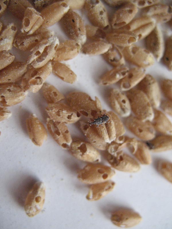Вот, к примеру, зерно, пораженное долгоносикоми (справа) сам долгоносик (слева). Тут сразу заметно, что пшеница вся, как решето.