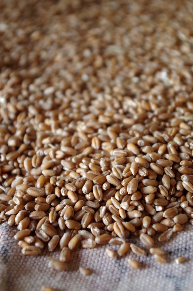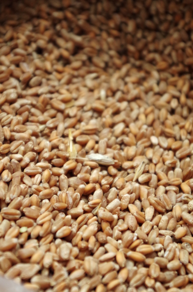 Имея за плечами такой серьезный опыт, мне все равно этого было мало, хотелось более обстоятельного и серьезного подхода, по крайней мере, серьезнее, чем детские воспоминания. Я спросила у мельников и учебников, мне рассказали, что для получения пшеничной цельнозерновой муки на производствах обычно используют зерно второго класса (а всего их - шесть), в котором содержание клейковины варьируется от 23 до 27%. У этой пшеницы есть определенные показатели влажности, стекловидности, и другие показатели, но все эти характеристики невозможно определить на глаз, о них должны говорить лабораторные исследования и документы. Поэтому, выбирая, прежде всего, стоит обращать внимание на то, как зерно выглядит, исходя из его «внешних данных», можно сделать хоть какие-то первоначальные выводы о его качестве. Оно должно быть приглушенно оранжевого или коричневого цвета, желательно, без пятен. Кроме того, оно должно быть «полным» наощупь, не высушенным, не съежившимся, не проросшим. Влажное мягкое зерно может говорить о браке, но о влажности тоже сложно судить по внешним признакам, оно может быть твердым и полным на первый взгляд, а внутри при этом быть сырым. Влажность пшеничного зерна должна быть примерно на уровне 14%, но, опять-таки, об этом могут сказать лишь документы, которые прилагаются к этому зерну.