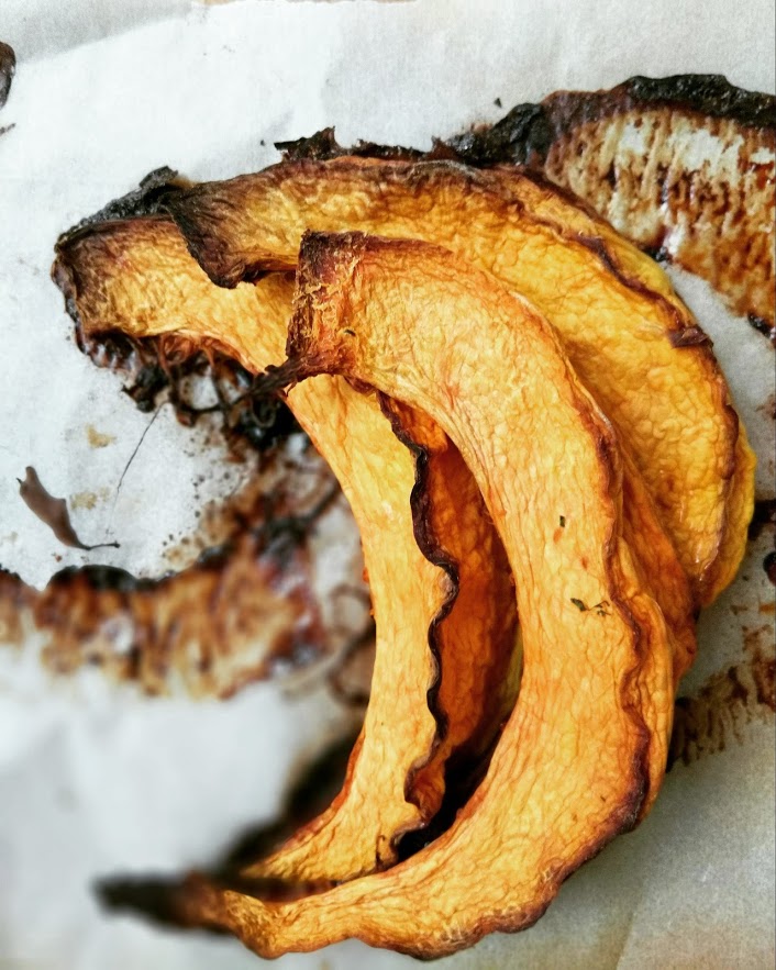 - Тыкву очистите от кожуры, нарежьте примерно одинаковыми кусками, сбрызните оливковым маслом и запеките в духовке (можно вообще заранее сделать и при желании заморозить).