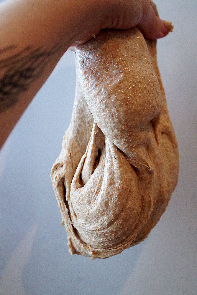 Даже при условии, что закваска у вас сильная и активная, хлеб все равно может получаться грубым и крошиться, например, из-за плохо развитой клейковины теста. Вы заметили, что тесто с развитой клейковиной прекрасно растягивается, оно одновременно и эластичное, и упругое? Эти качества развиваются в тесте по мере развития клейковины и именно благодаря им в хлебе образуется нежная кружевная пористость. Тесто как бы обволакивает пузырьки газа, растягиваясь при этом, а, чем лучше развита клейковина, тем лучше и тоньше она тянется. Говоря «тонкостенные поры», мы обычно подразумеваем поры с тонкими прозрачными стенками, изобилие таких пор, благодаря чему и получается пышность. Если клейковина теста развита слабо или наоборот тесто перемешано, поры у хлеба получаются не сильно выраженные, как бы поврежденные, или крупные грубые, при этом хлеб может крошиться, а его корка может рваться и трескаться в процессе выпечки.