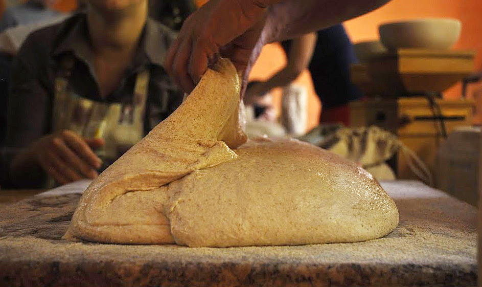 - Если тесто липкое и тянется (уже на столе), один раз сложите: возьмите за один край теста и сложите, как книжку, без особых усилий и давления, слегка натянув поверхность теста.