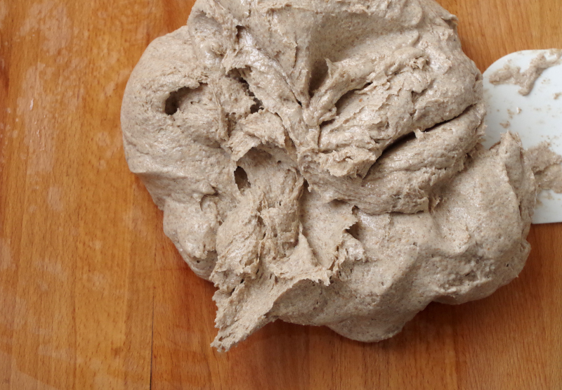 На первой скорости смешайте все ингредиенты в деже тестомеса и и вымешивайте 20 минут на 2,5 скорости - для Ankarsrum Original и около 15 минут насадкйо лопатой на 1-2 скорости - для спиральных миксеров тестомесов. Клейковина заметно не разовьется, но тесто начнет немного тянуться.