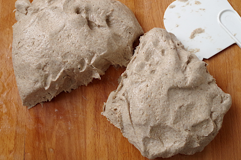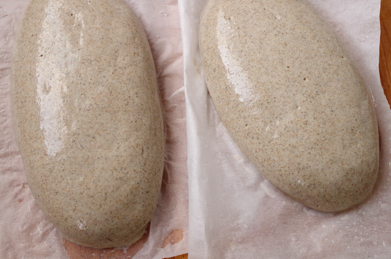 С помощью скребка (у меня большой и с его момощью переносить хлеб очень удобно) перенесите на пергамент, подправьте форму при необходимости, присыпьте семечками или, как я - жмыхом, или оставьте, как есть.
