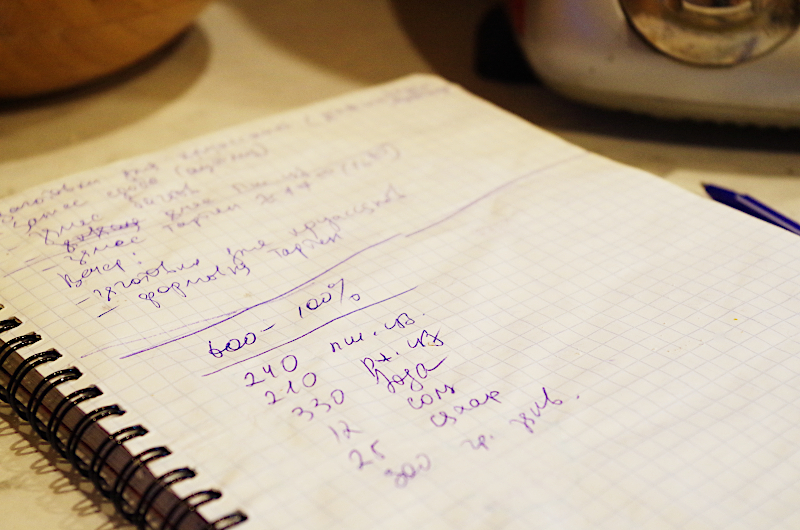 - Высчитываю влажность: 600 делю на 100 и умножаю на 80, получаю общее количество воды в рецепте, которое равняется 480.