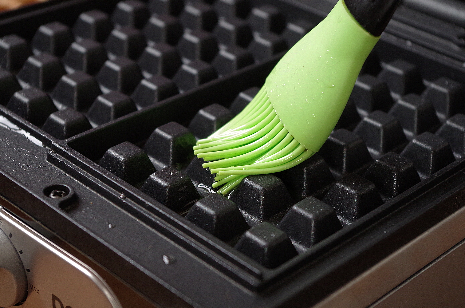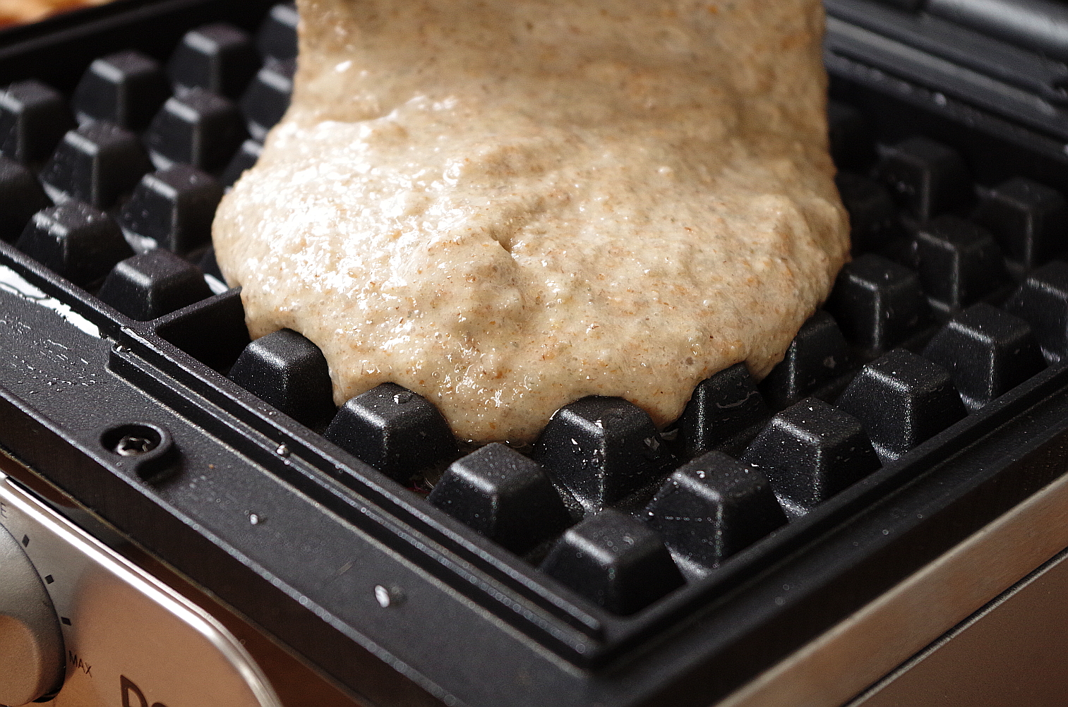 Мокрым половников или ложкой выложите немного теста на разогретые пластины вафельницы и закройте ее. Пеките вафли около 5 минут (или больше) в зависимости от мощности вашей вафельницы и цвета корочки, которую хотите получить.