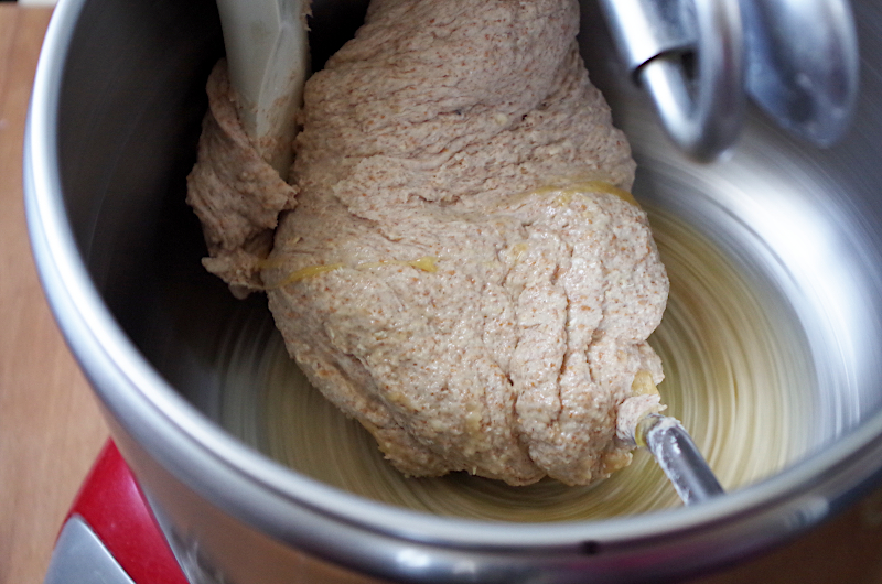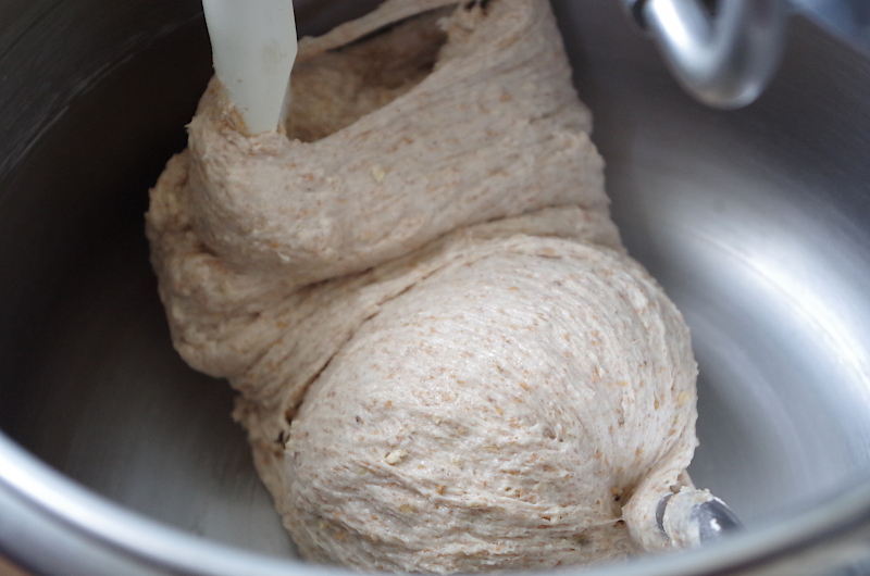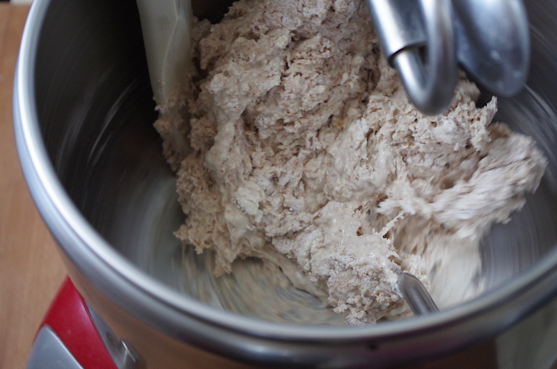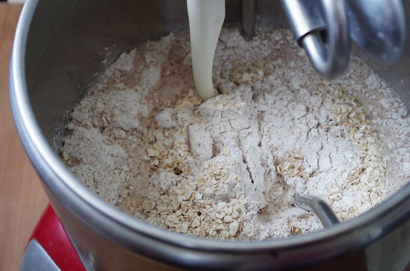 Затем смешайте всю жидкость и закваску, добавьте всю муку и овсянку, перемешайте до однородности и оставьте на полчаса. Я замешивала в тестомесе Ankarsrum, поэтому все происходило в большой чаше))