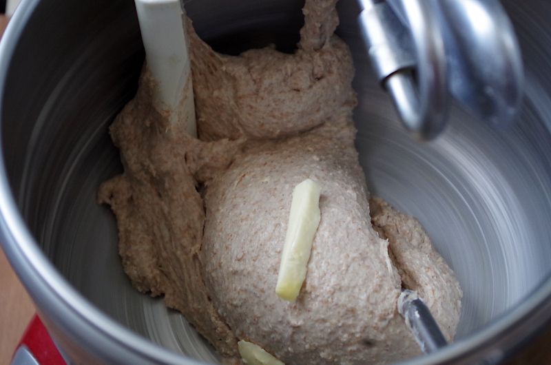 В самом конце замеса, когда тесто станет гладким, эластичным и однородным, внесите сливочное масло кусочками. Масло должно быть прохладным, но пластичным, если оно у вас замерзшее, заверните в пергамент или пленку и поколотите скалкой, это придаст маслу пластичности.