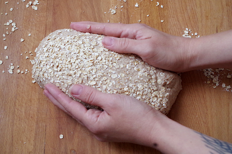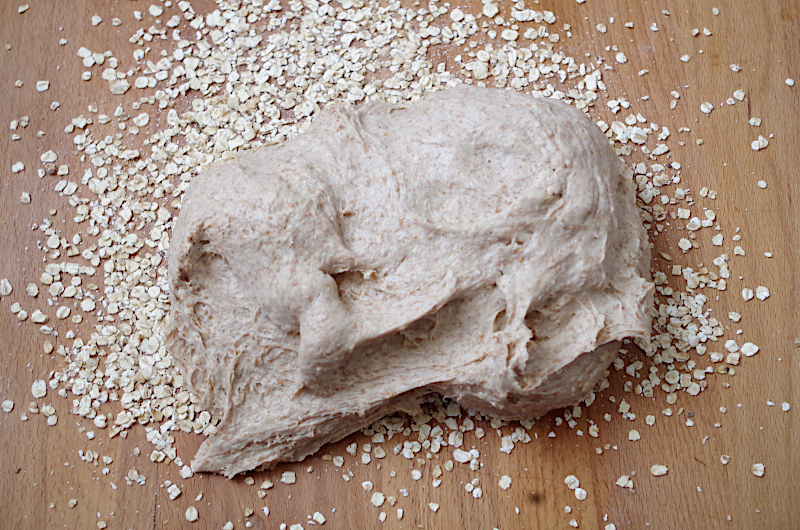 После замеса выложите тесто на стол, как следует посыпанный овсяными хлопьями.