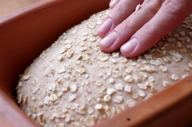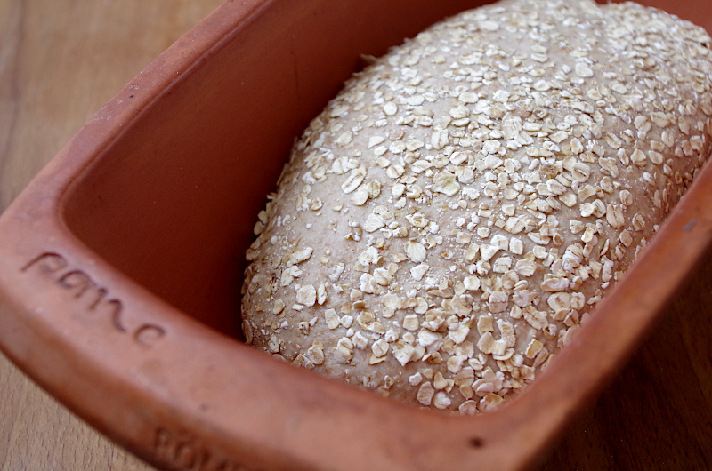 Уложите в подготовленную форму, затяните пленкой, оставьте примерно на 3,5-4 часа при температуре около 26°. У меня керамическая форма Roemertopf, которую я предварительно нагрела и натерла воском (чтоб воск плавился), и остудила перед тем, как класть туда тесто.