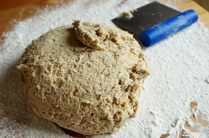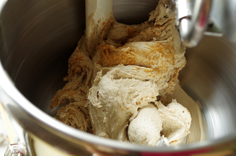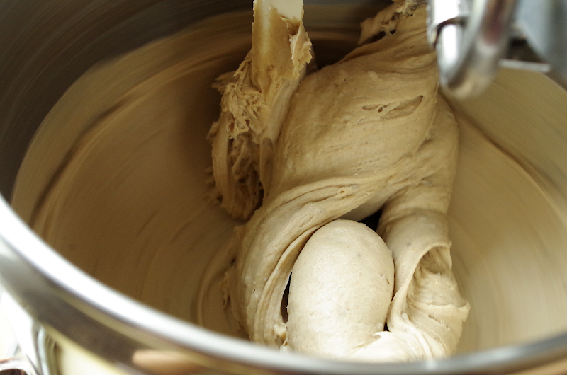 Продолжительность замеса около 25 мин. на 2-2,5 скорости тестомеса Ankarsrum или около 20 мин. в профессиональном спиральном тестомесе. Миксеры типа китчен-эйда или кенвуда такое тесто месят не очень хорошо, вам нужно будет останавливать миксер и соскребать тесто со стенок. Руками, признаться, я не представляю, как это тесто месить, оно очень неудобное и липкое и, если у вас нет машинки или помощника, которому можно было бы доверить замес, просто замесите, как сможете. В результате замеса тесто должно стать более однородным и даже немного эластичным. Да, друзья ржаное тесто может быть эластичным, может даже тянуться, конечно, не так, как пшеничное, но все равно то, на что оно способно после хорошего замеса - удивительно.