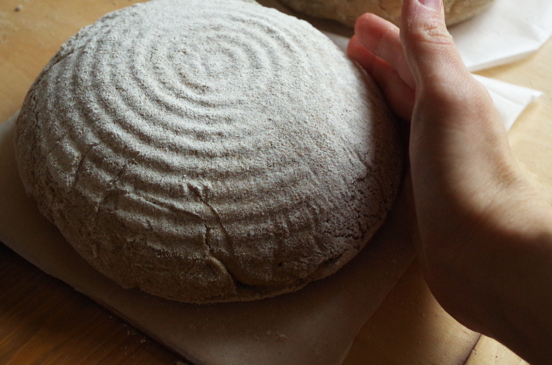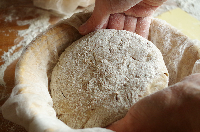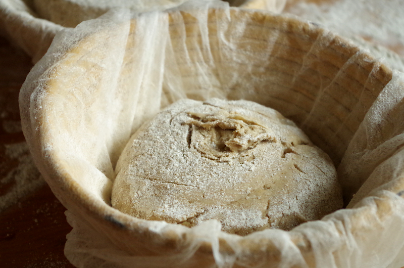 - Сформуйте аккуратным заминанием круглые буханки, пригладьте мукой, уложите в застеленные корзинки швом ВНИЗ.