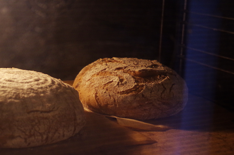 Расстоявшийся хлеб переверните швом вверх или швом вниз в зависимости от того, хотите вы колючую корку или гладкую, и отправьте на камень.