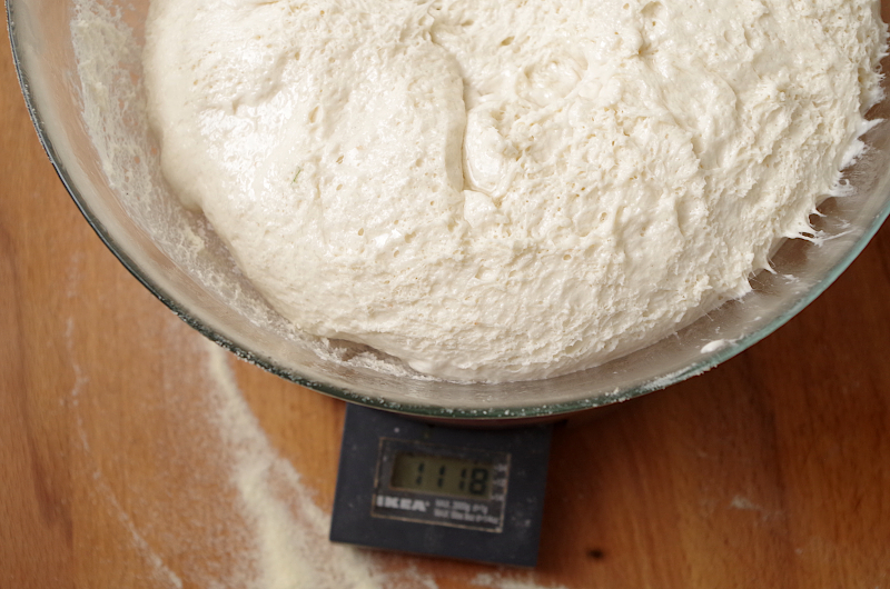 Я прикинула, что в тесте для “француза” чуть больше 6 порций муки (655:100=6,5), которые я могу использовать для своего теста. По большому счету, я могу просто взвесить тесто, узнать его общий вес и разделить на 6,5. Если вы хотите использовать не 100, а, например, 150 гр. муки в патэ ферментэ, то вам нужно вес теста разделить на 150.