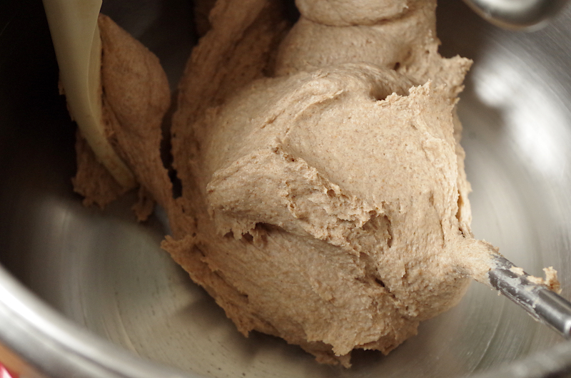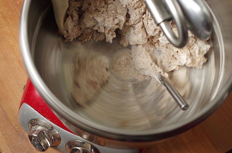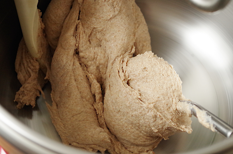 Как только мука увлажнится, переключите тестомес на 2-2,5 скорость. Тесто получится в меру густым, поэтому скорость работы тестомеса можно увеличить, чтобы степень воздействия на тесто сохранилась привычная. Сначала тесто будет рыхлым, потом станет более гладким, вот таким: