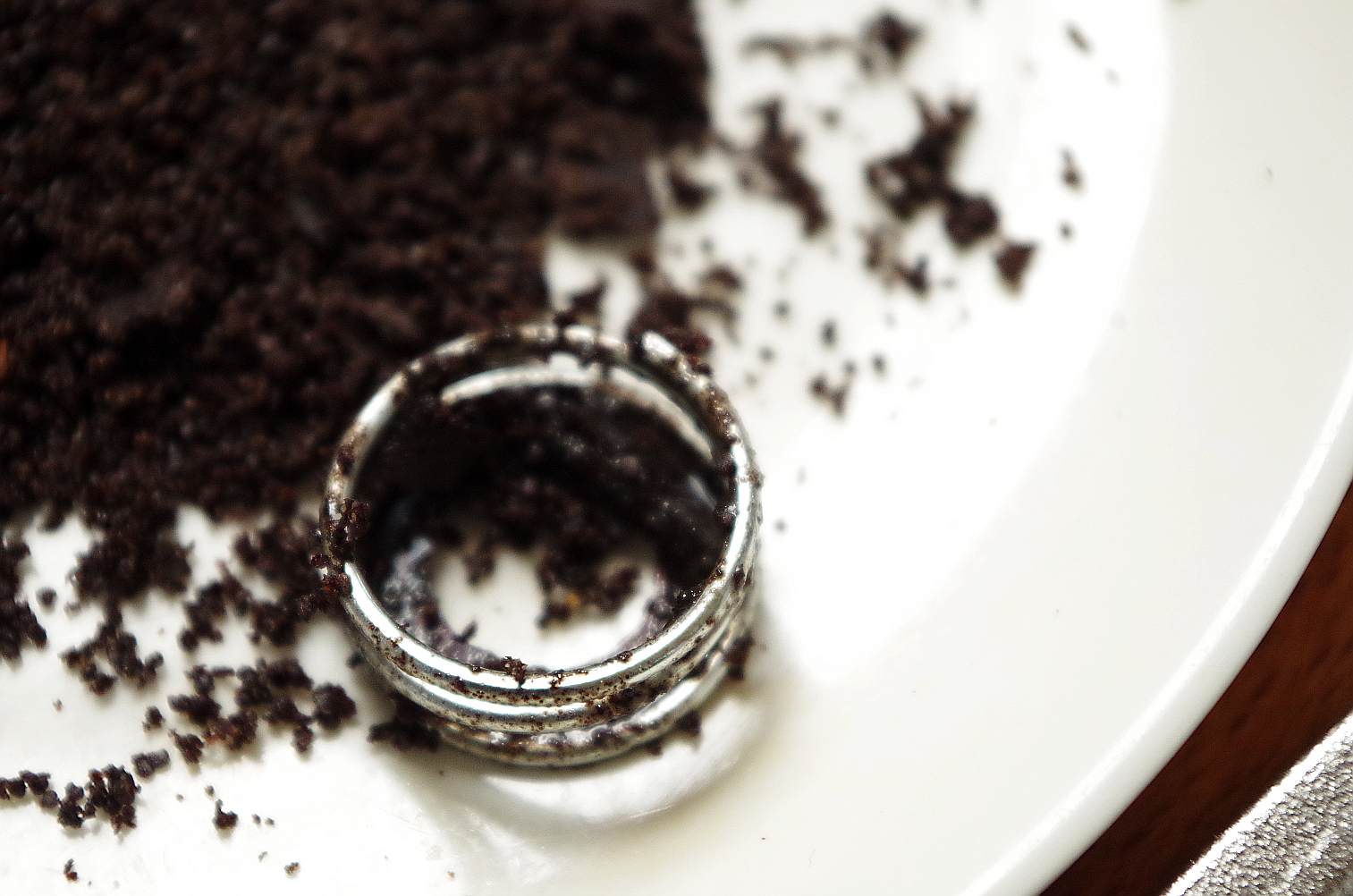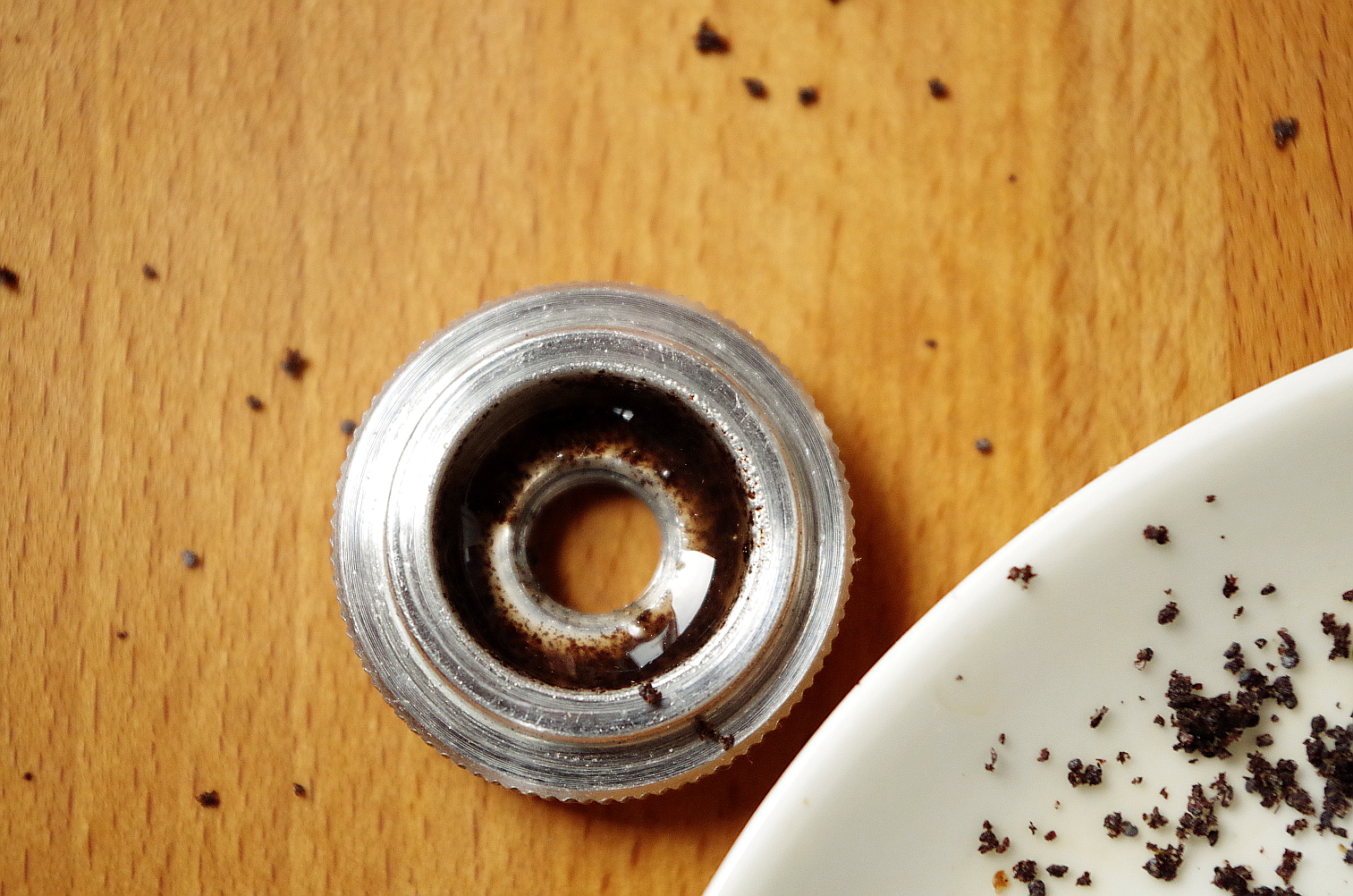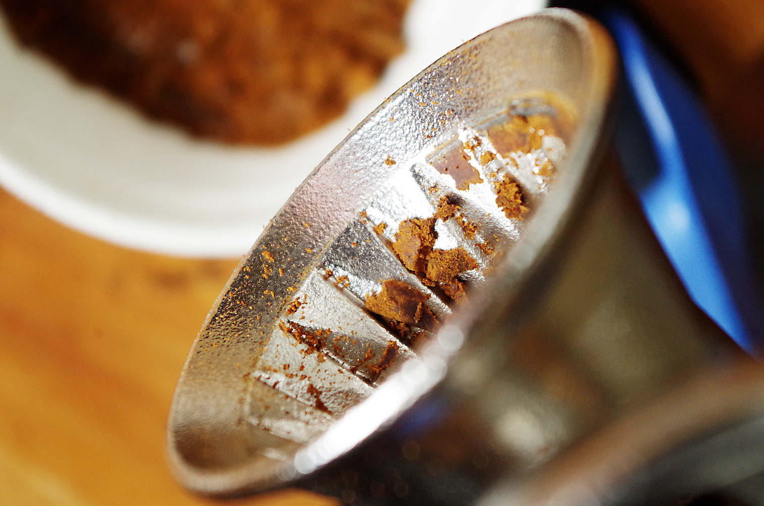 Кстати, я не сразу заметила: на задней стенке внутри мельницы имеет тенденцию собираться и накапливаться прочный слой остатков того, что в ней измельчалось. Слой очень твердый, его запросто можно принять за часть корпуса, но пусть это вас не вводит в заблуждение. Корпус у мельницы чистый и блестящий, а слой, хоть и твердый, кажется, как железо, шершавый, черный и неровный. Его нужно счистить ножиком, можно под струей горячей воды отковырять.
