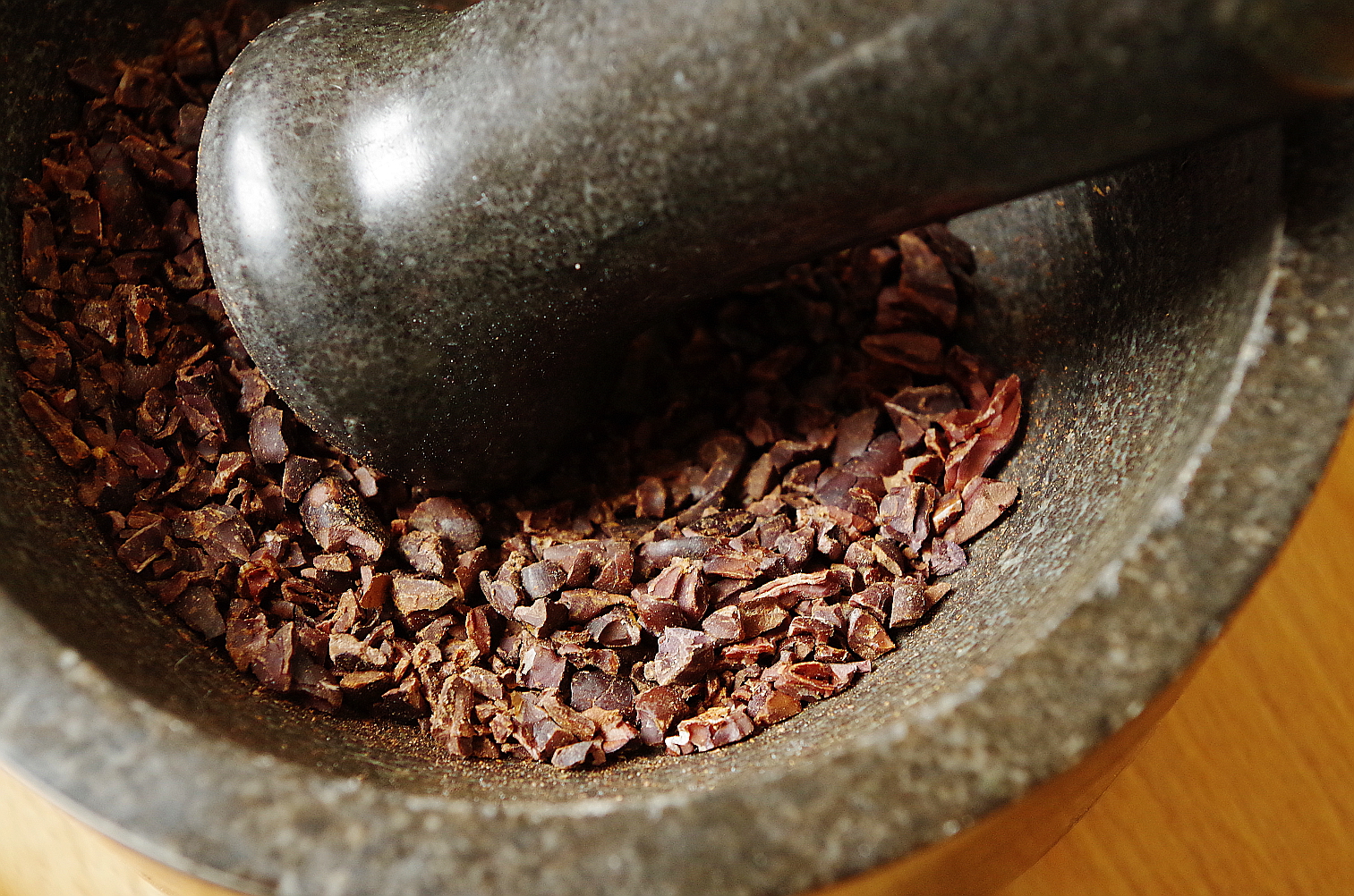 Не попробовать перетереть какао-бобы я не могла! У меня была горсть неочищенных бобов, которые я предварительно почистила и разбила в ступе.