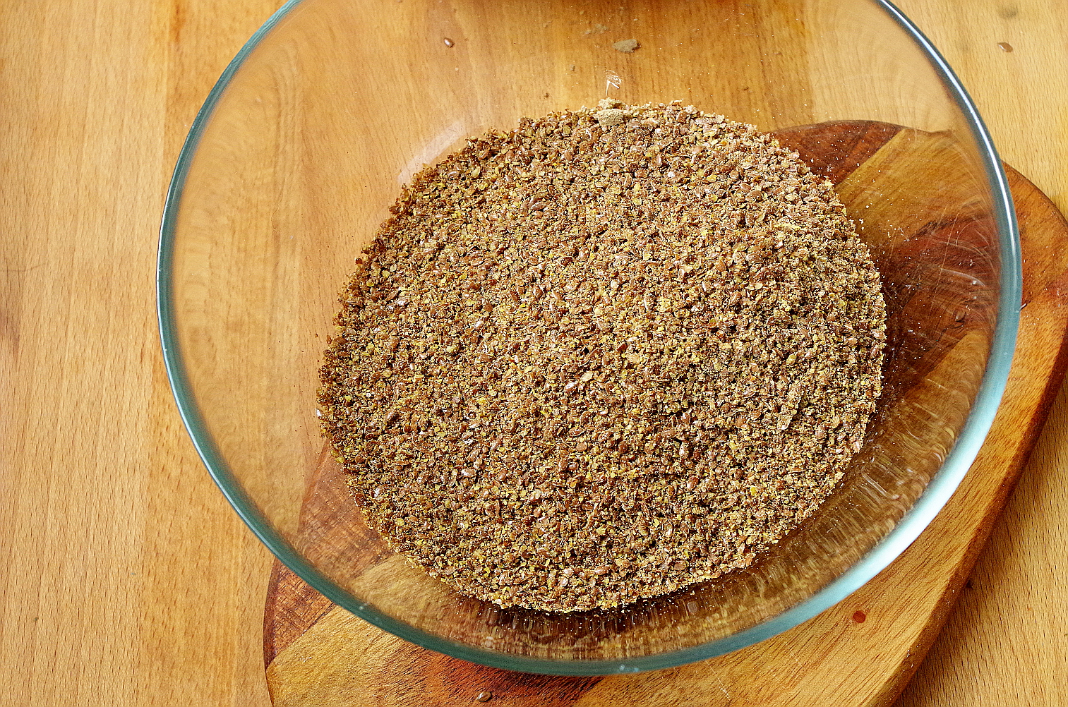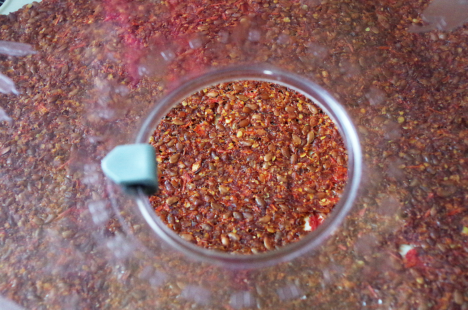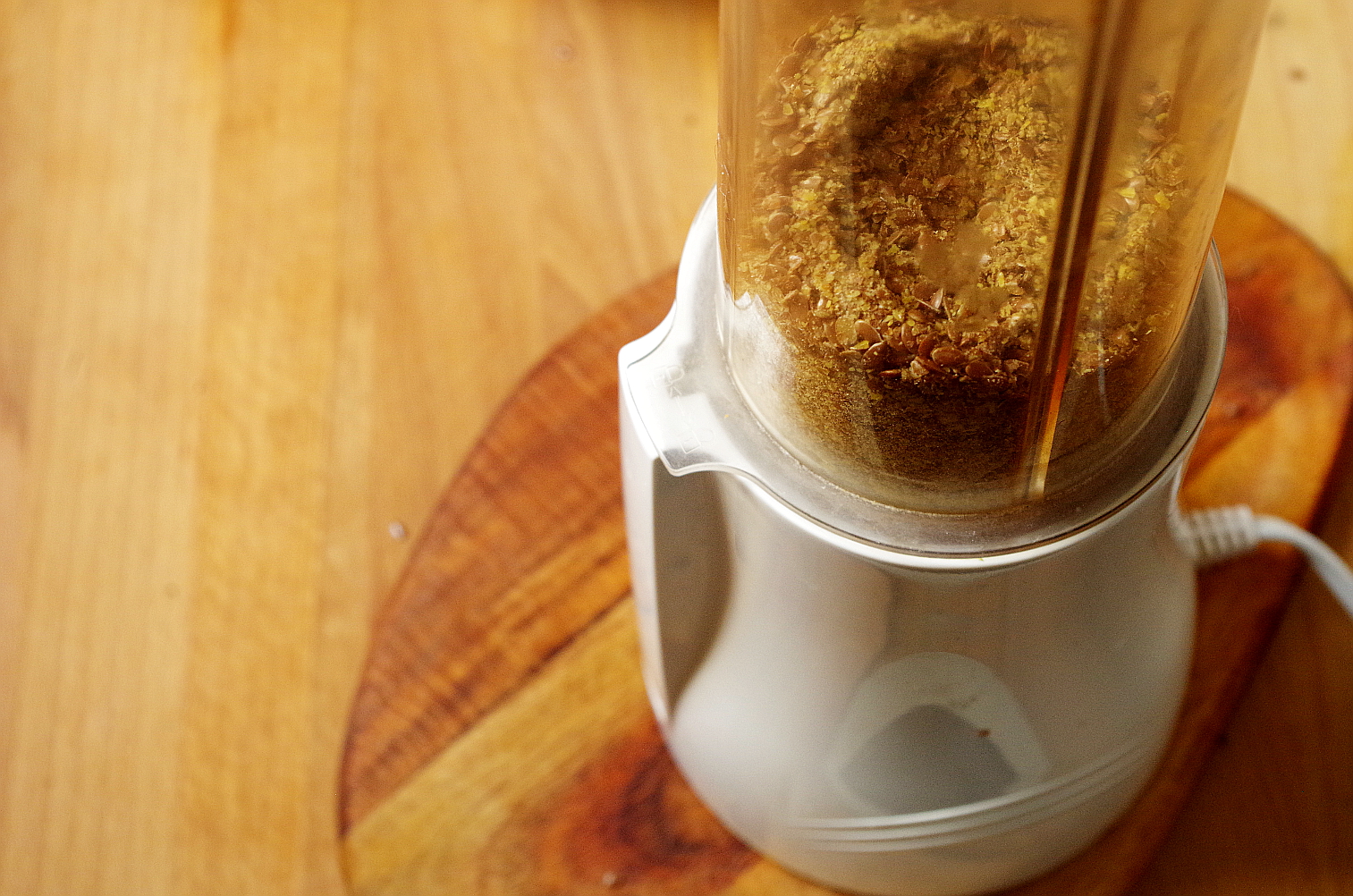 Лен измельчите, но не в порошок. Я использовала свой небольшой блендер Tribest, он прекрасно справляется с измельчением семечек орехов.