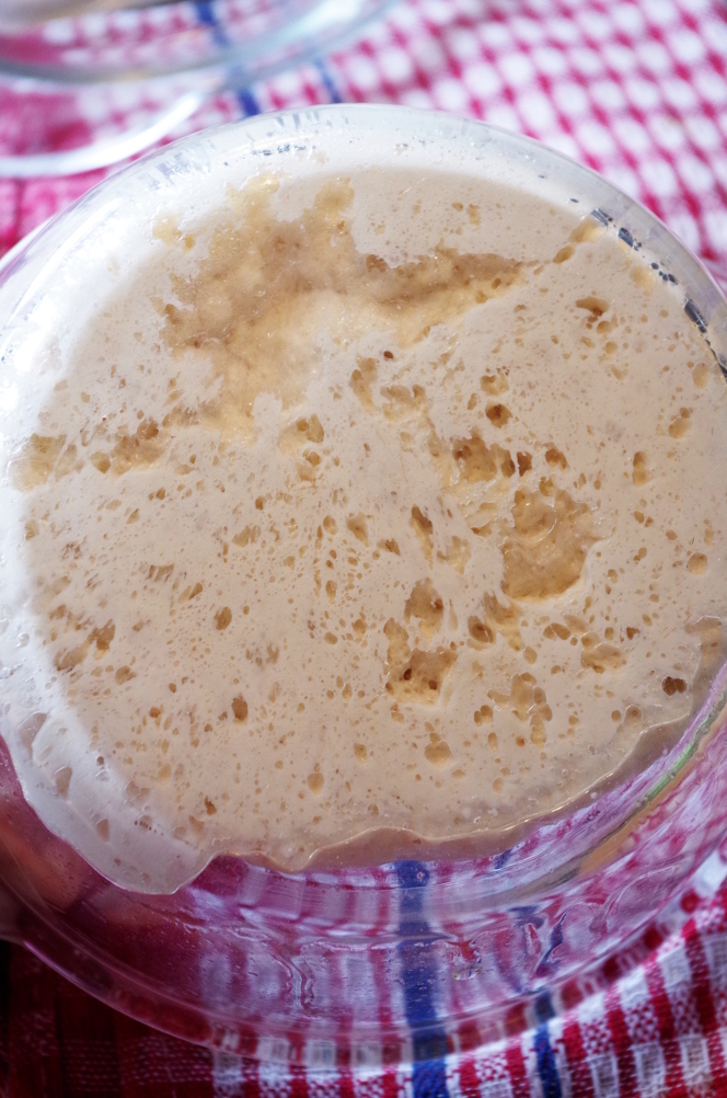 Смешиваем, накрываем пленкой, даем подняться до пика. У меня на это ушло около 6-7 часов, но на скорость подъема закваски влияет температура и активность стартера.