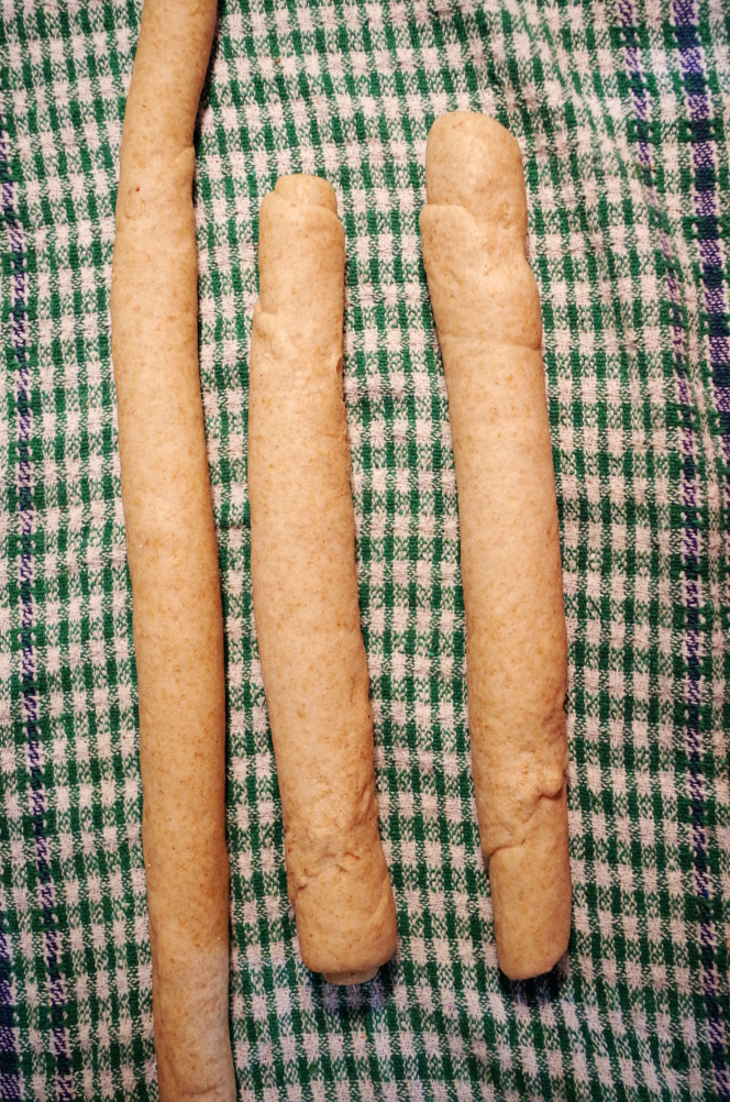 Рулеты складываем на полотенце и даем немного отдохнуть, потом на чистом сухом столе руками энергично выкатываем жгуты. Это очень увлекательное занятие, напоминающее то, как дети катают из пластилина «колбасу», очень много общего. Начинаем от середины и постепенно движемся к краям, стараясь не смять концы жгутов.  Важно, чтобы стол был чистым, без муки, иначе тесто будет ездить и не будет кататься. Вот для сравнения готовый жгут и два рулета перед «выкатыванием».