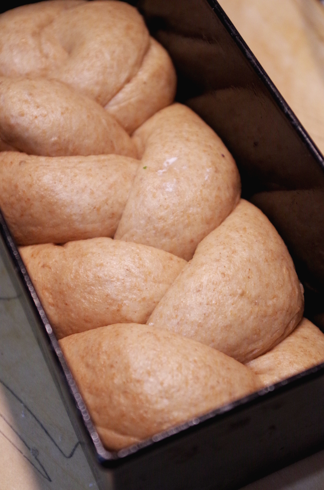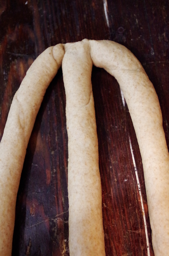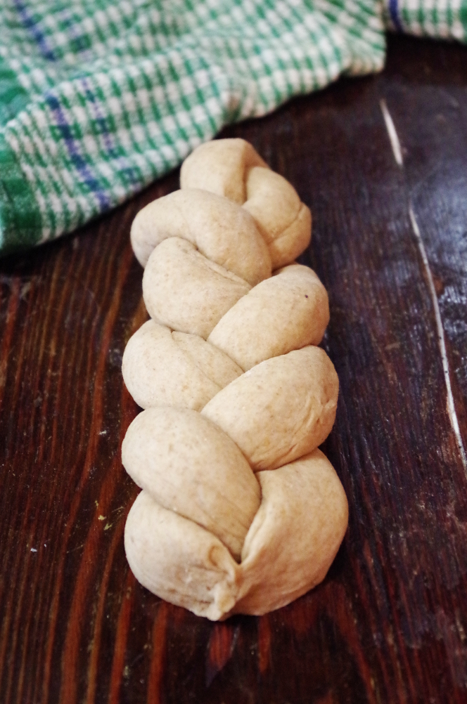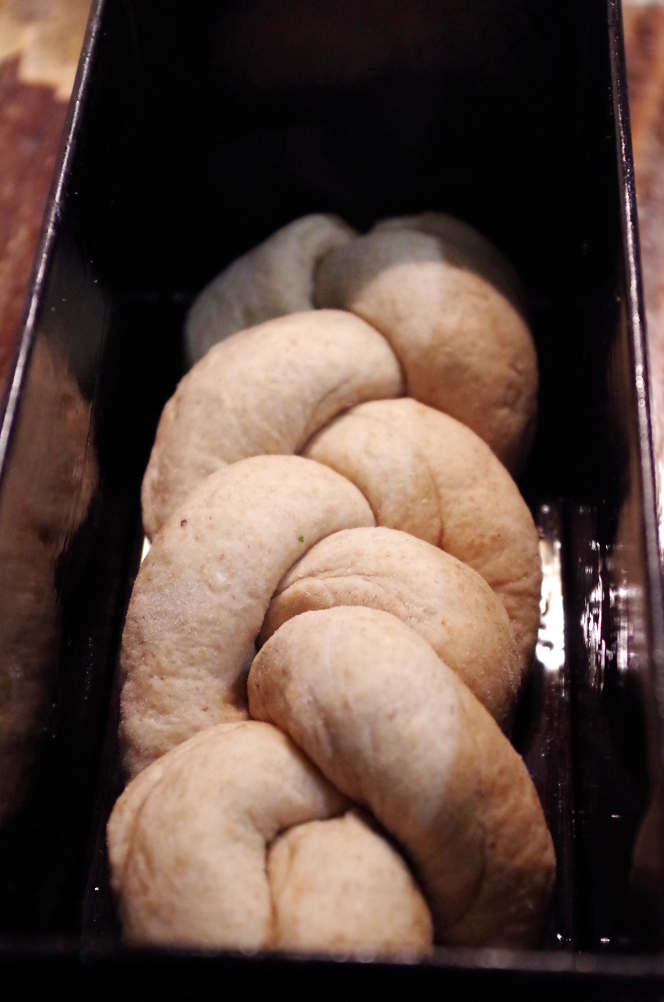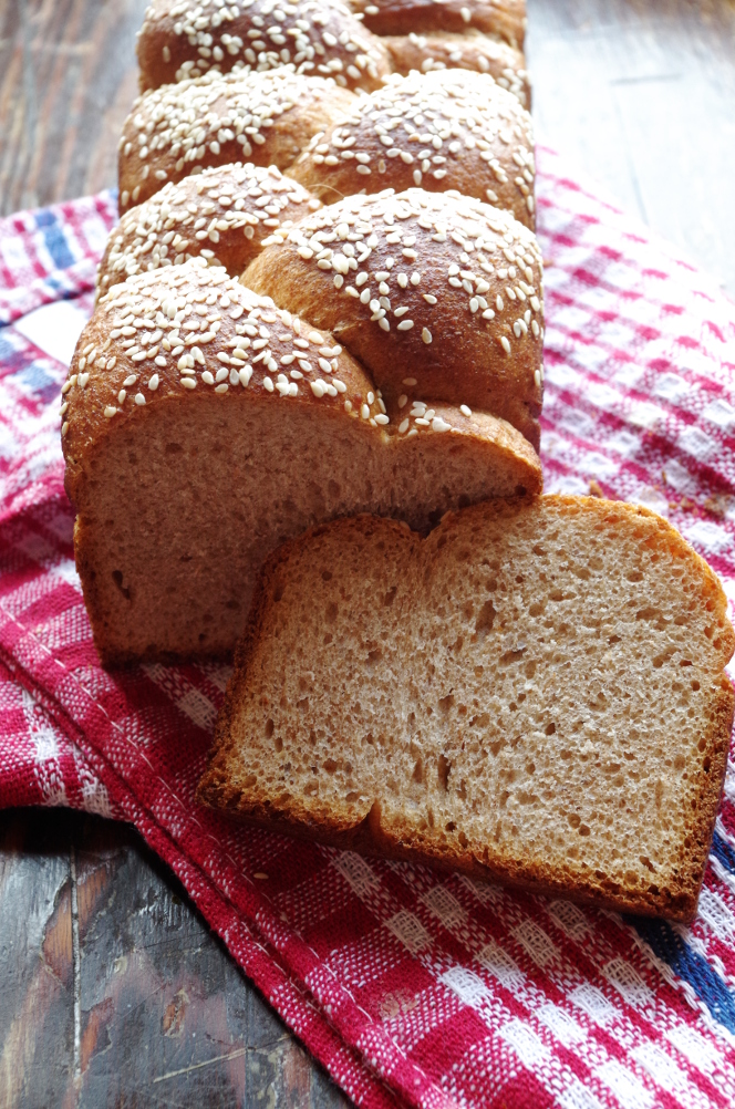 А вы пробовали печь цельнозерновую халу, да еще и на закваске? Я свою сделала на манер литовской — сплела из трех жгутов и испекла в прямоугольной форме. Мне такой хлеб очень нравится: делается очень просто и в то же время увлекательно, а получается эффектно и красиво. Вкус у цельнозерновой халы сильно отличается от халы из белой пшеничной муки. Если «белая» хала — нежная, пуховая, волокнистая, то «черная», которая из цельнозерновой муки, более хлебная, с хлебным ароматом и деликатной сладостью. Булкой такую не назовешь, хотя, конечно, все зависит от количества сдобы. В нынешнем варианте ее не много, всего 1 яйцо, горстка сахара и четверть чашки масла.