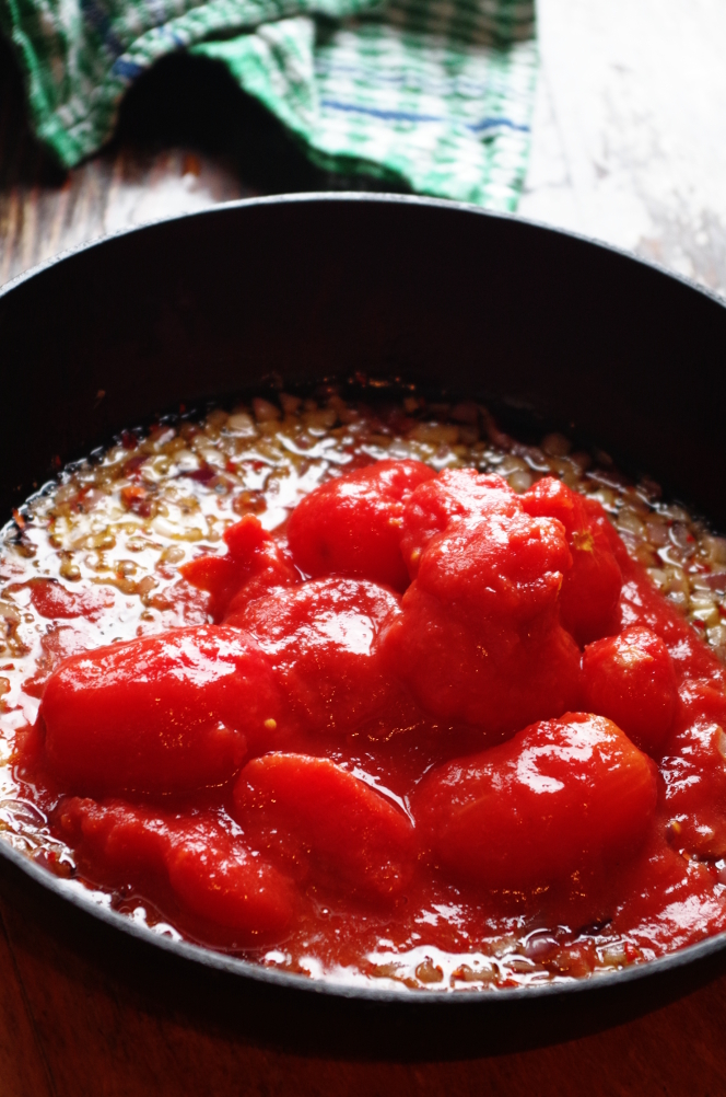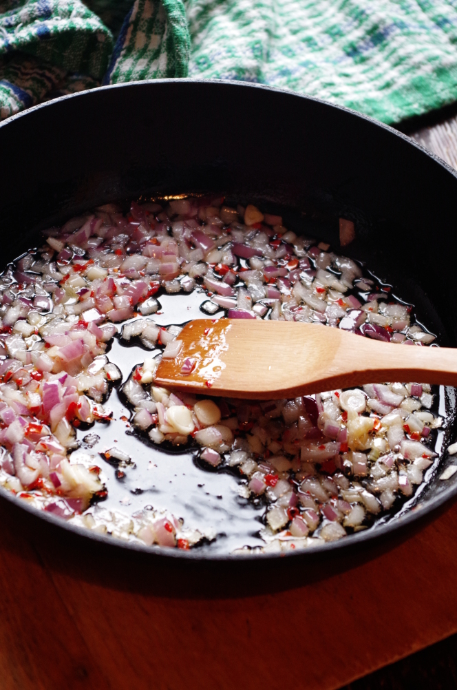 Делаем соус. Лук режем кубиками, чили мелко рубим, обжариваем все на масле до мягкости и прозрачности лука. Добавляем томаты.
