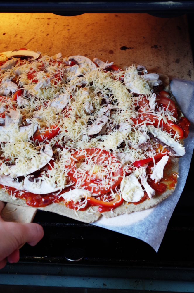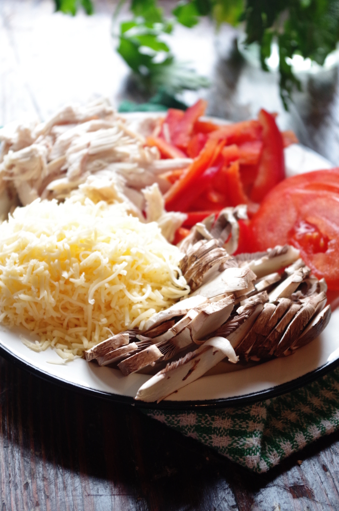Посыпаем соус сыром (берем треть, остальное сыпем сверху на начинку), выкладываем начинку. Тут самая большая вероятность запороть пиццу — это перегрузить ее начинкой. Всего должно быть в меру и начинки в пице тоже. Раскладывая все, что у нас под рукой, в идеале должен получиться 1 слой (не считая соуса и сыра), может, два, но желательно не больше.