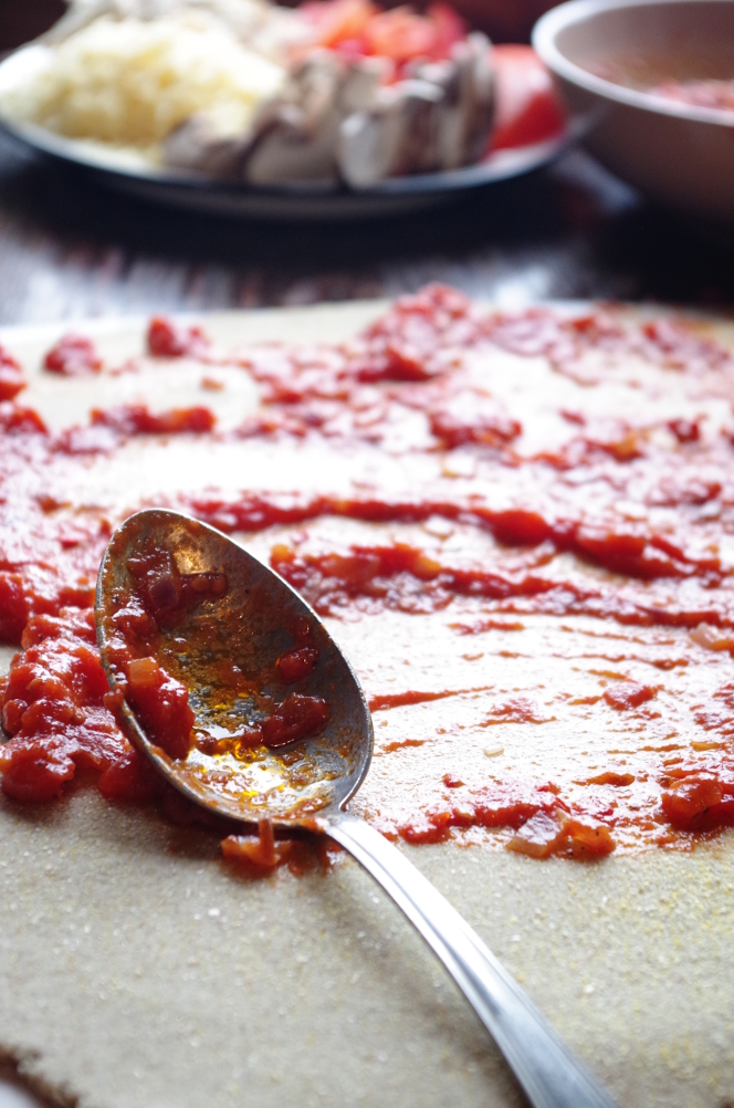 Раскатываем тесто в тонкий пласт и сразу переносим его на пергамент и намазываем соус.