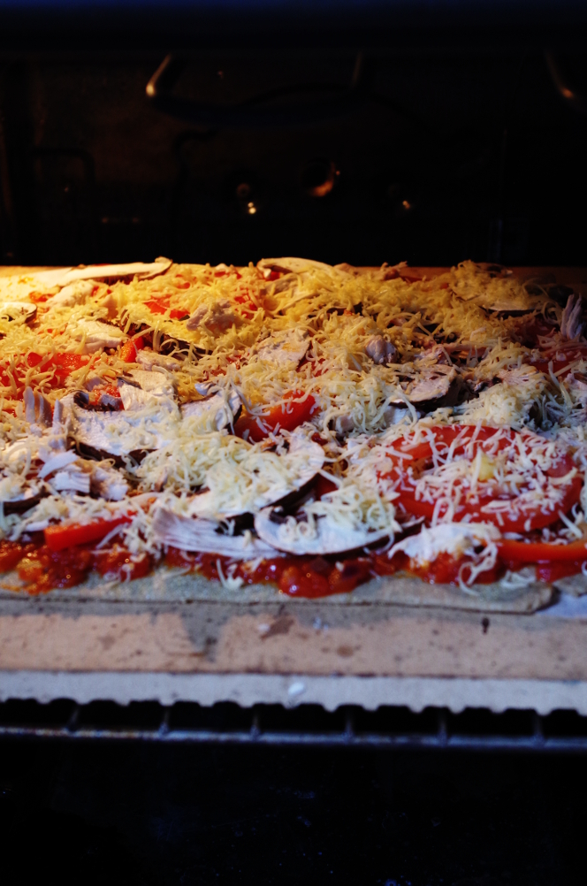 Лопатой переносим пиццу на хорошо разогретый камень, печем около 15-20 минут, периодически проверяя, чтобы низ не пригорел.