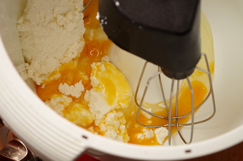 - Миксером или в тестомесе с помощью венчиков для взбивания смешайте творог с яйцами, не переставая взбивать, влейте масло, сахар и соль.
