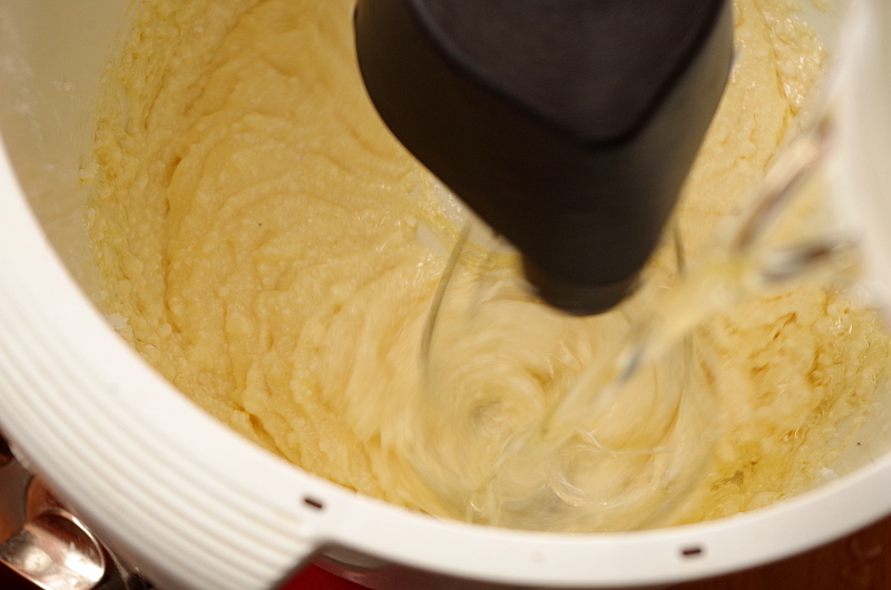 - Добавьте часть муки, чтобы получилось мягкое тесто, потом добавьте сыворотку или кефир, перемешайте. Венчики для взбивания поменяйте на венчики для смешивания и внесите остальную муку.