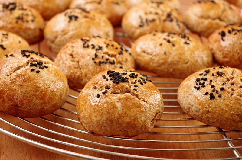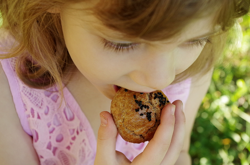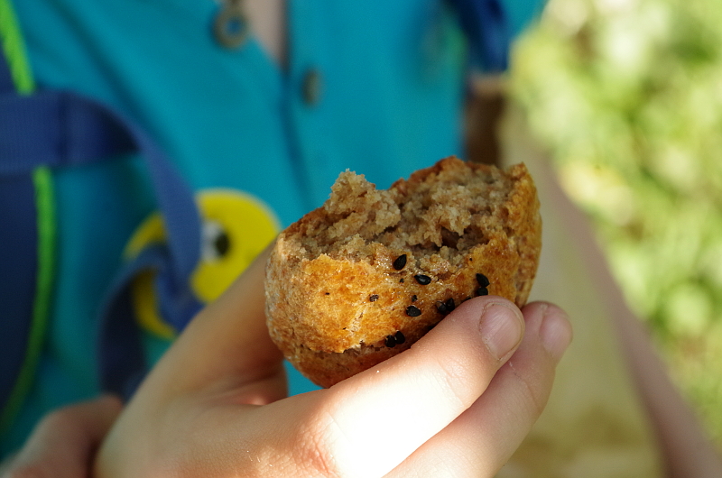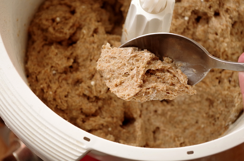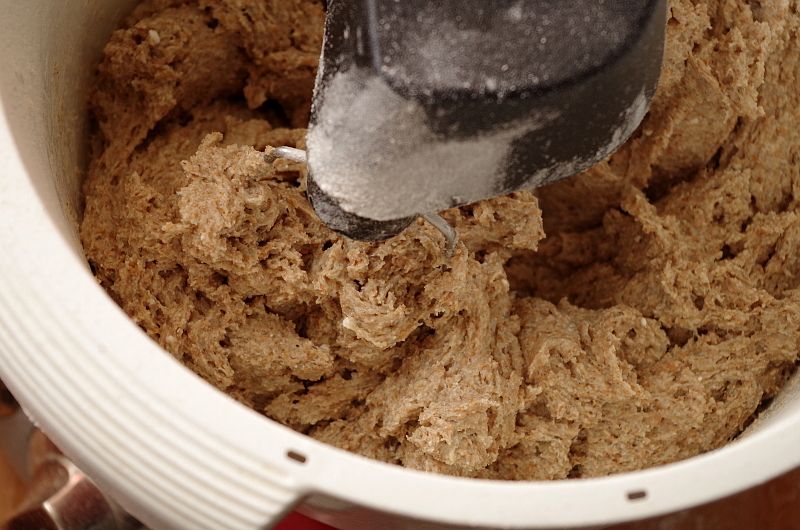 В таких рецептах все просто: смешать все влажные ингредиенты, все сухие, перемешать, дать минут 15-20 постоять, чтоб сода среагировала с кислотой, и выпекать. Я замешивала в тестомесе Ankarsron Original венчиками для взбивания, а потом венчиками для смешивания. Перед тем, как печь, смолола свежей муки на своей мельничке Hawos Queen1.