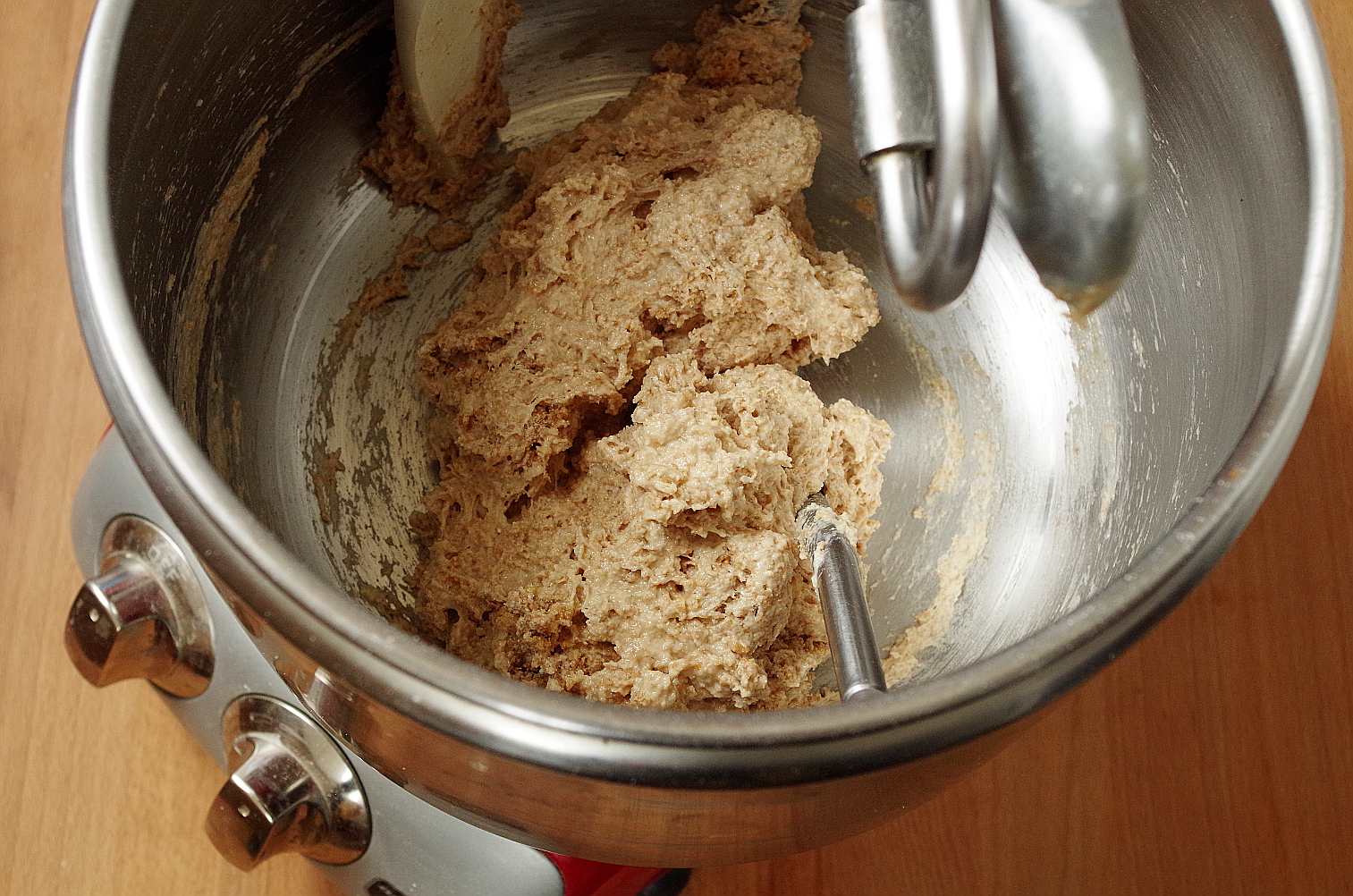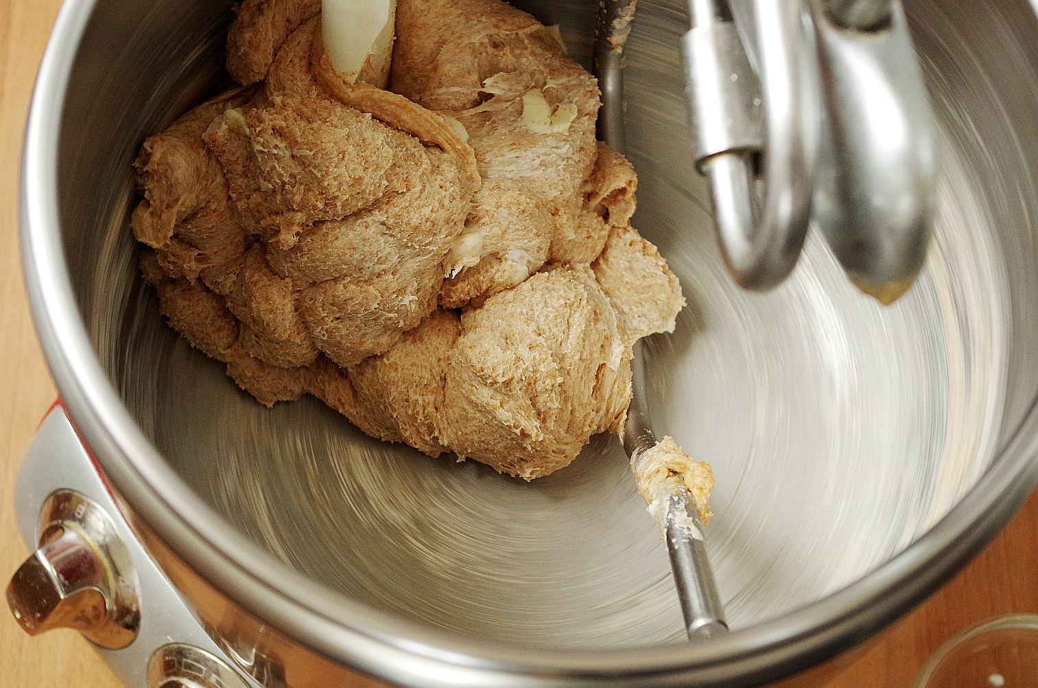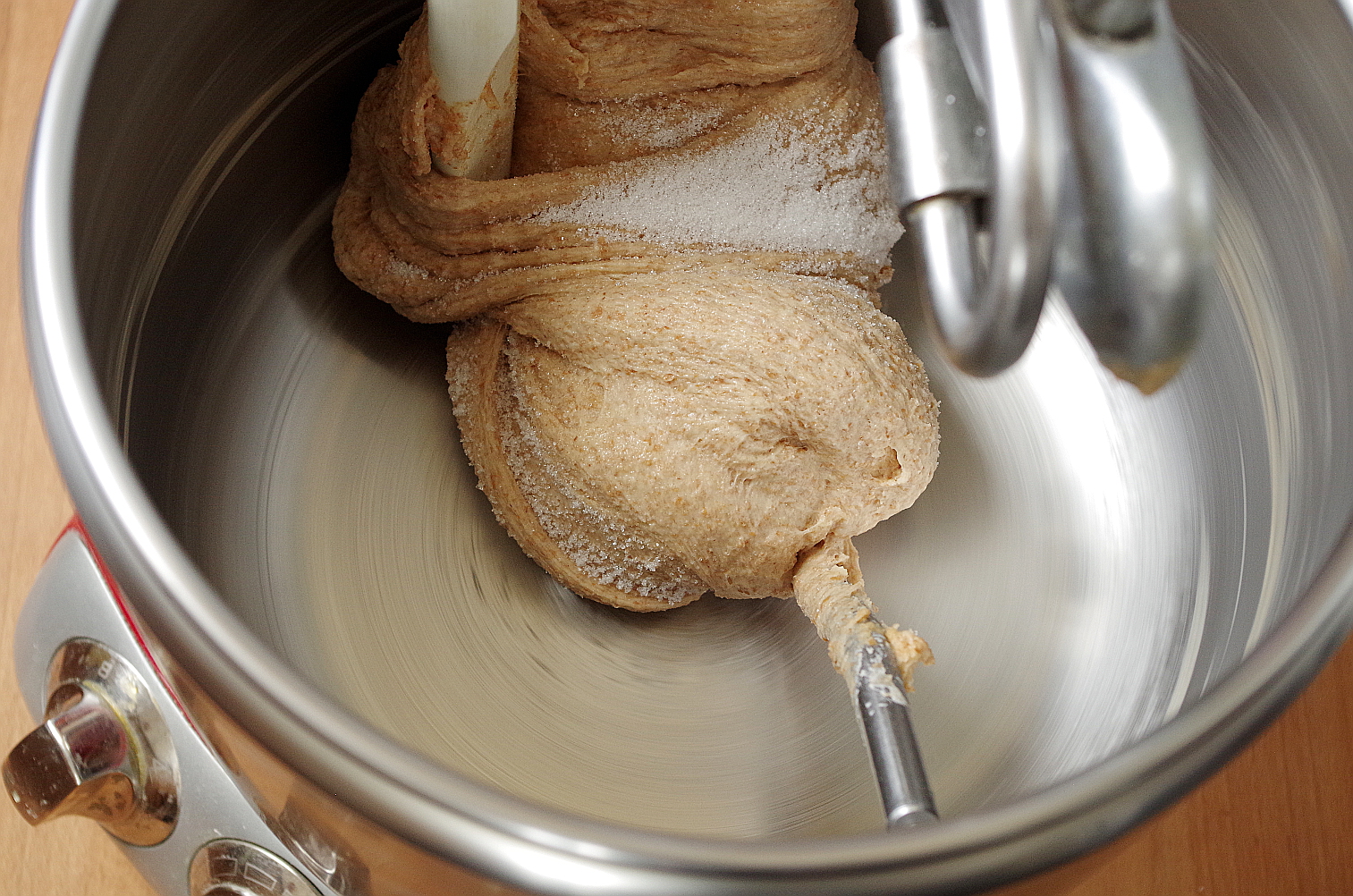 После отлежки добавьте соль, начните активный замес. Как только клейковина начнет развиваться, а тесто станет более гладким, в два подхода внесите сахар.