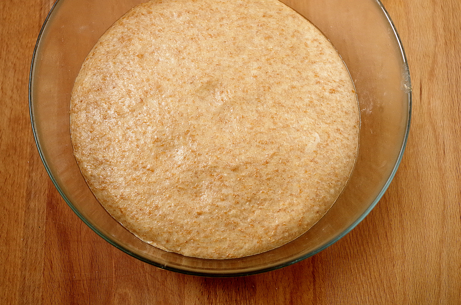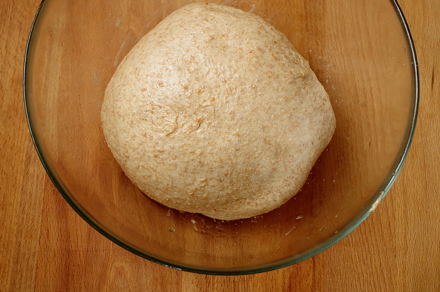 Сложите тесто в плотный шар, уложите в миску, смазанную растительным маслом. Желательно, чтоб миска была прозрачной, чтоб вы могли наблюдать за тем, как разрыхляется тесто. Через 40 минут сложите тесто.