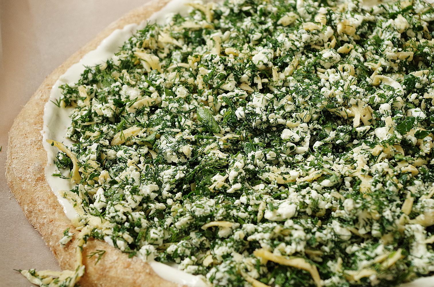 Смажьте лепешку сметаной, равномерно распределите творог, сверху выложите перец, ничего не солите, чтоб творог и зелень не стали выделять влагу!