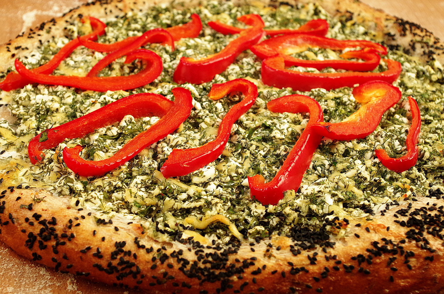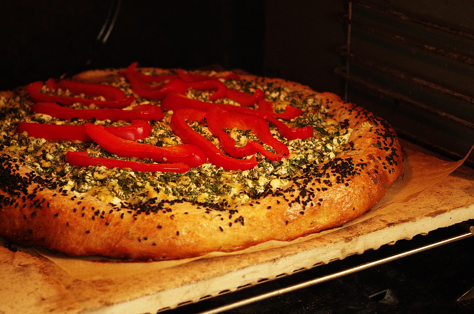 Пока тесто бродит, подготовьте начинку: порубите зелень, натрите твердый сыр и смешайте с творогом, нарежьте ломтиками перец, подготовьте яйцо для смазывания, включите духовку разогреваться с камнем. Температура - 230 градусов.