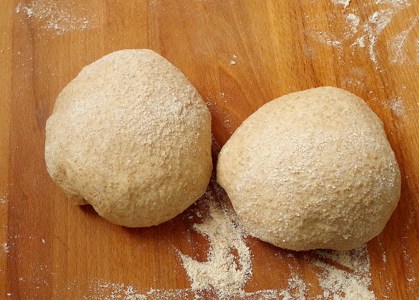 Выложите его на рабочую поверхность, присыпанную мукой, скребком разделите на две части, каждую округлите, оставьте минут на 10 отдохнуть.
