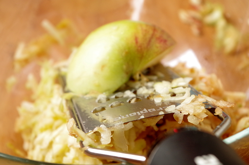 Яблоки (4 шт.) натерла на очень острой крупной терке Microplane. На сайте несколько видов терок этого производителя и все они очень острые, поэтому к некоторым предусмотрен держатель, но я для видео все голыми руками)) Еще 4 яблока порезала средне-крупными дольками.