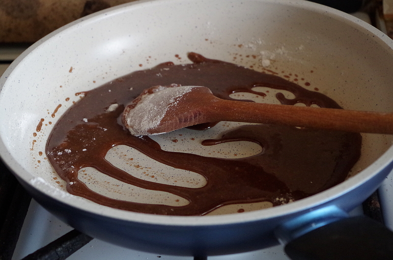 На сухую сковороду высыпала сахарную пудру, смешанную с корицей и довела на среднем огне сначала до растворения (все время помешивая), а потом закипания.