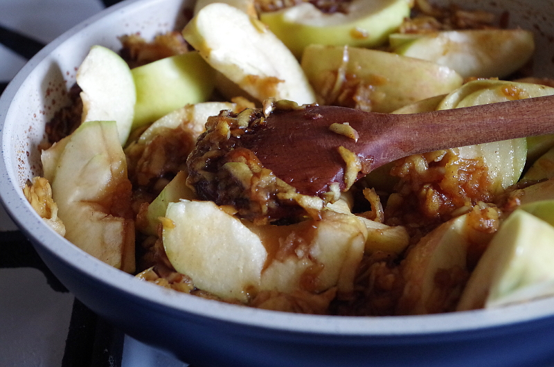 Как только карамель закипела - выложила натертые яблоки и тушила, помешивая, 3-5 минут.